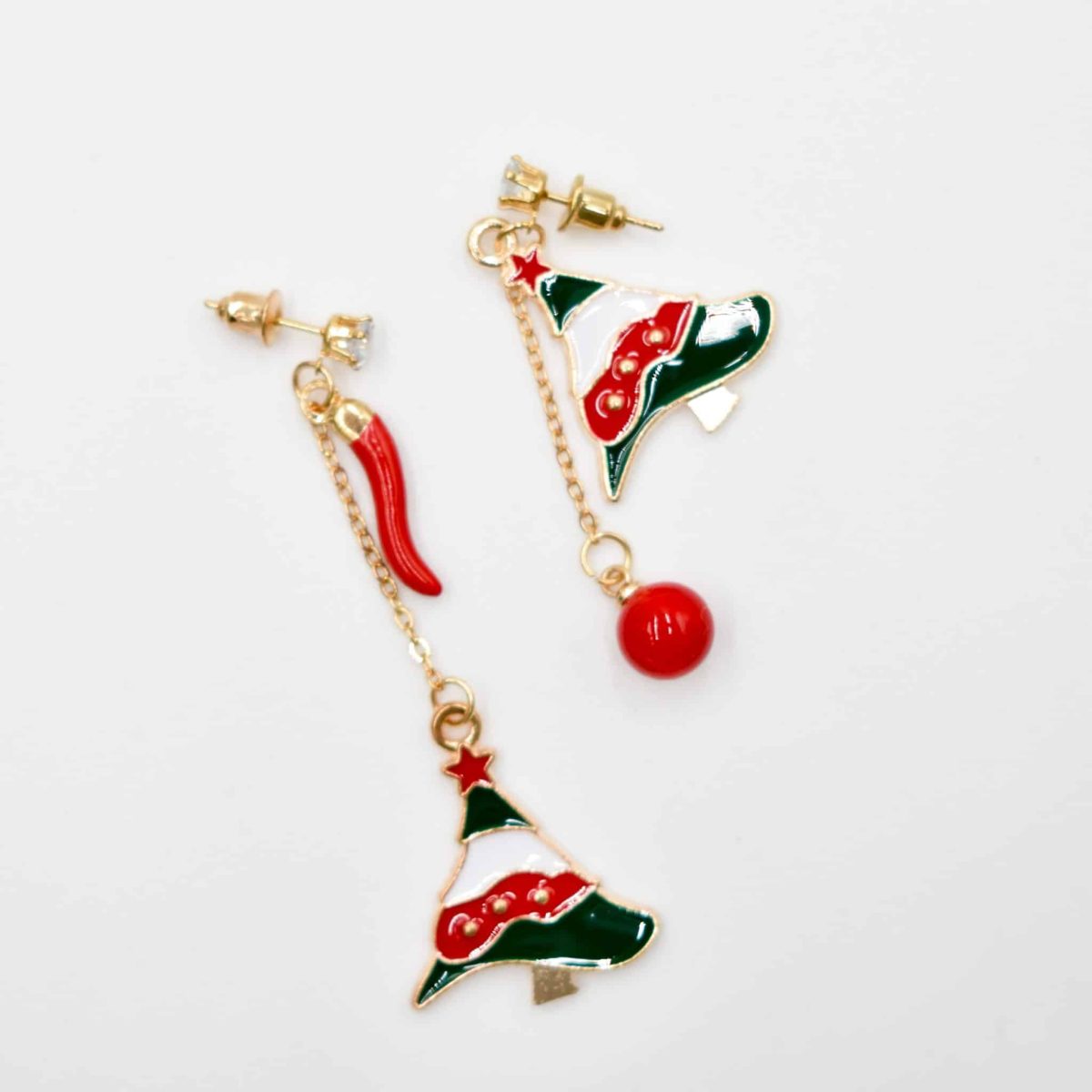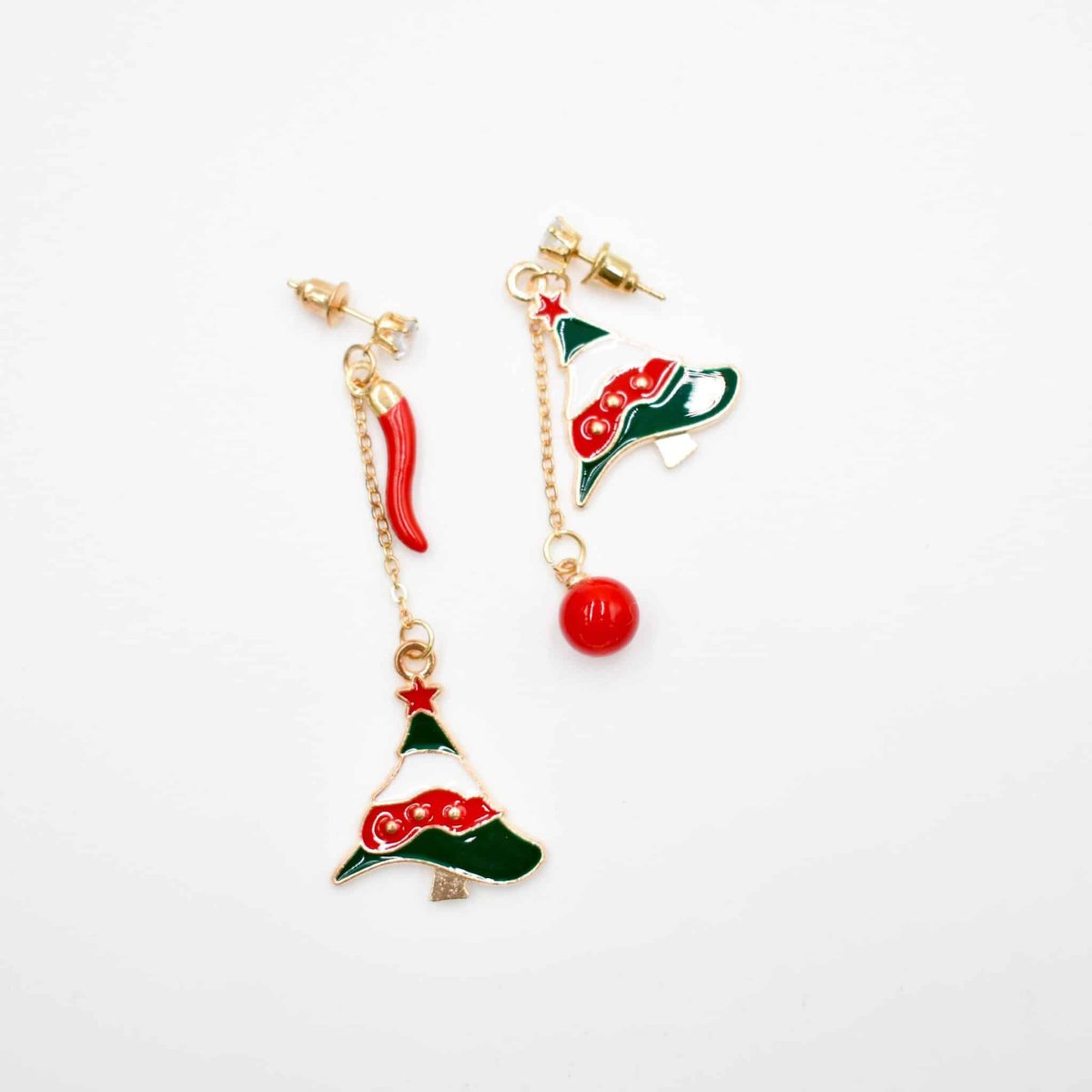 Get into the festive spirit with these Holiday Tree Mismatched Enamel Drop Earrings, designed with charming red-and-green Christmas tree pendants, a glossy red charm bead, and a playful chili-style accent for extra seasonal flair. Lightweight, colorful, and full of Christmas cheer, this adorable drop set is perfect for parties, gifting, or adding a joyful touch to your everyday holiday outfits.