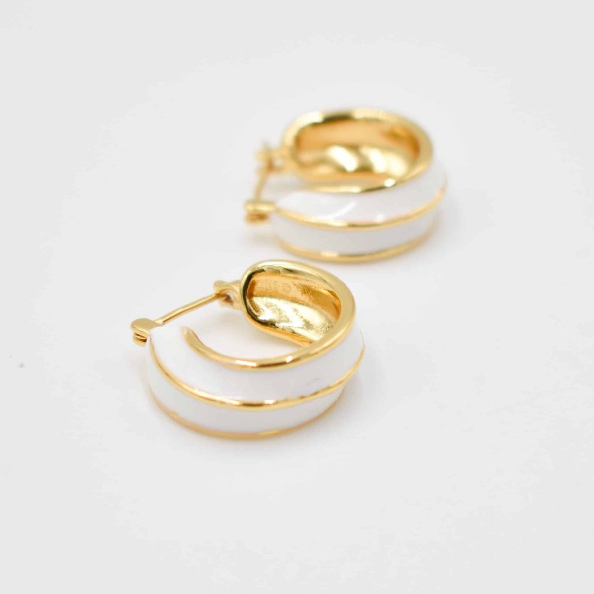 These stylish hoop earrings combine white enamel with gold edges in a sleek, modern twisted design.