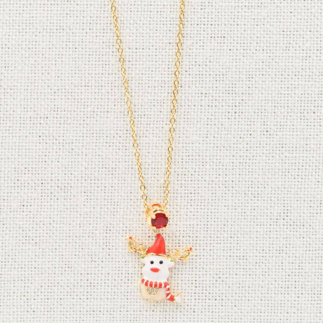 A playful gold-tone necklace featuring a cheerful snowman with festive antlers, a red Santa hat, and a striped scarf. Accented with a vibrant red crystal, this adorable piece is perfect for spreading holiday joy and adding a whimsical touch to your Christmas ensemble.