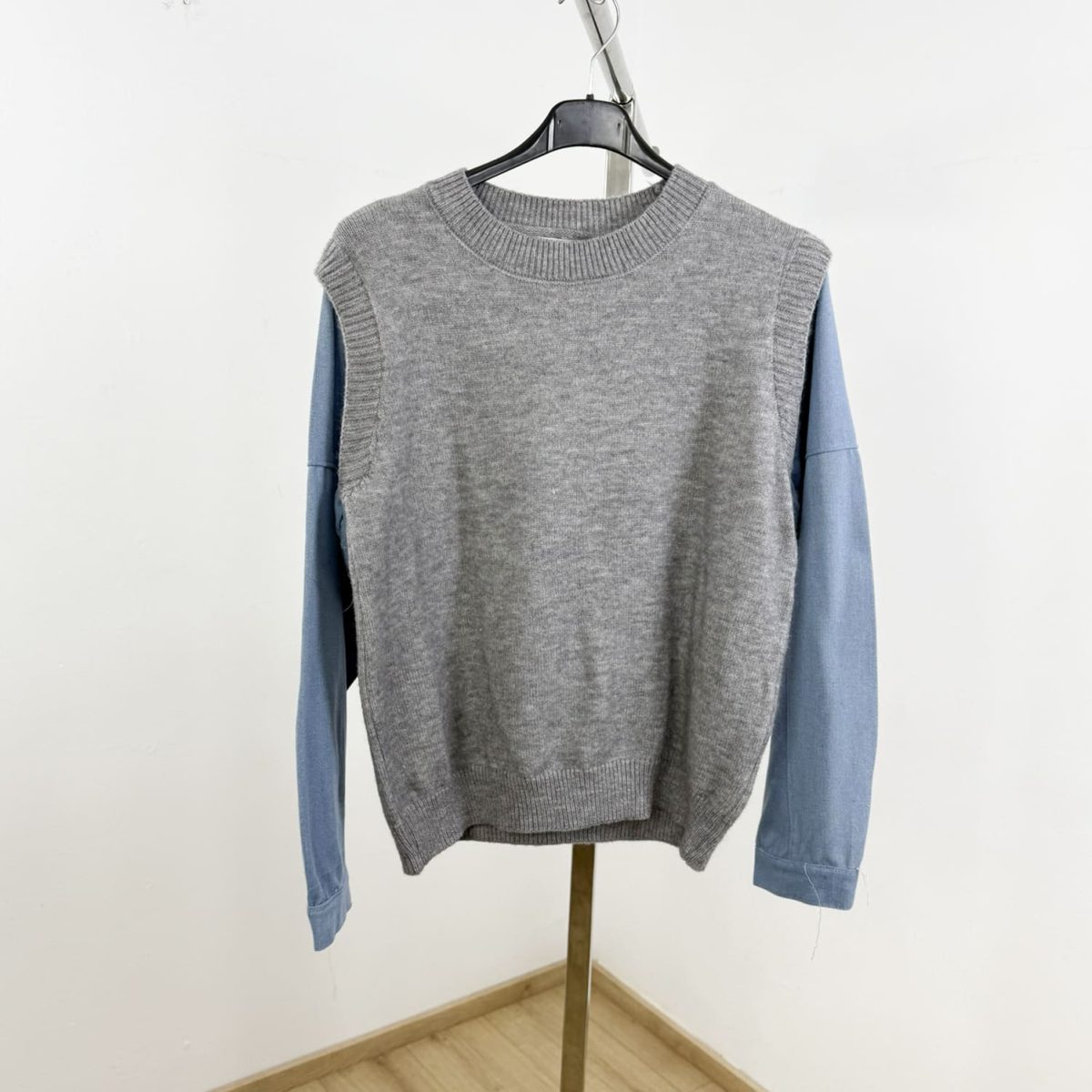 Whether you’re going for a coffee run or a casual night out, this knit sweater with denim sleeves adds a fresh twist to your wardrobe essentials.