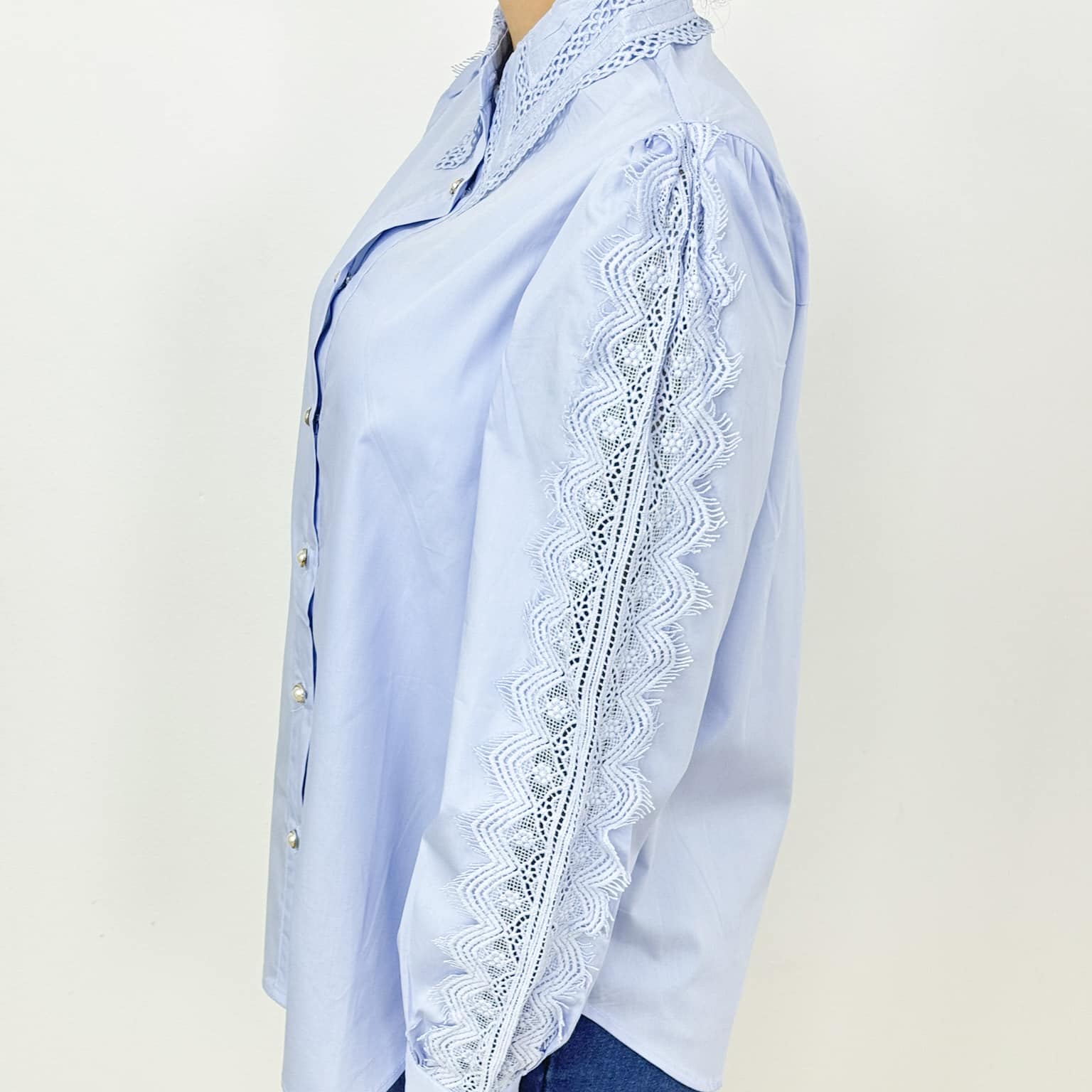 Intricate lace trim on collar and sleeves for a refined look