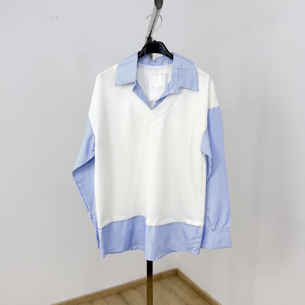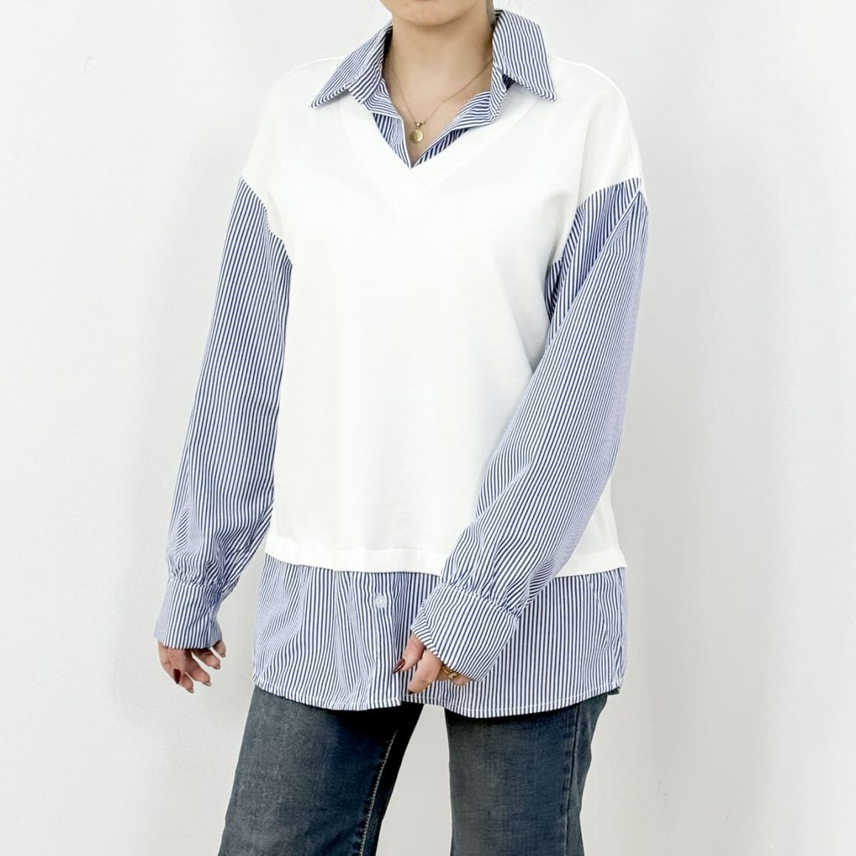 A stylish layered-look top combining the structure of a classic striped shirt with the softness of a knit overlay. This effortless two-in-one design gives you a polished, modern aesthetic without the bulk of multiple layers. Perfect for casual outings, workdays, or creating chic everyday outfits with ease.