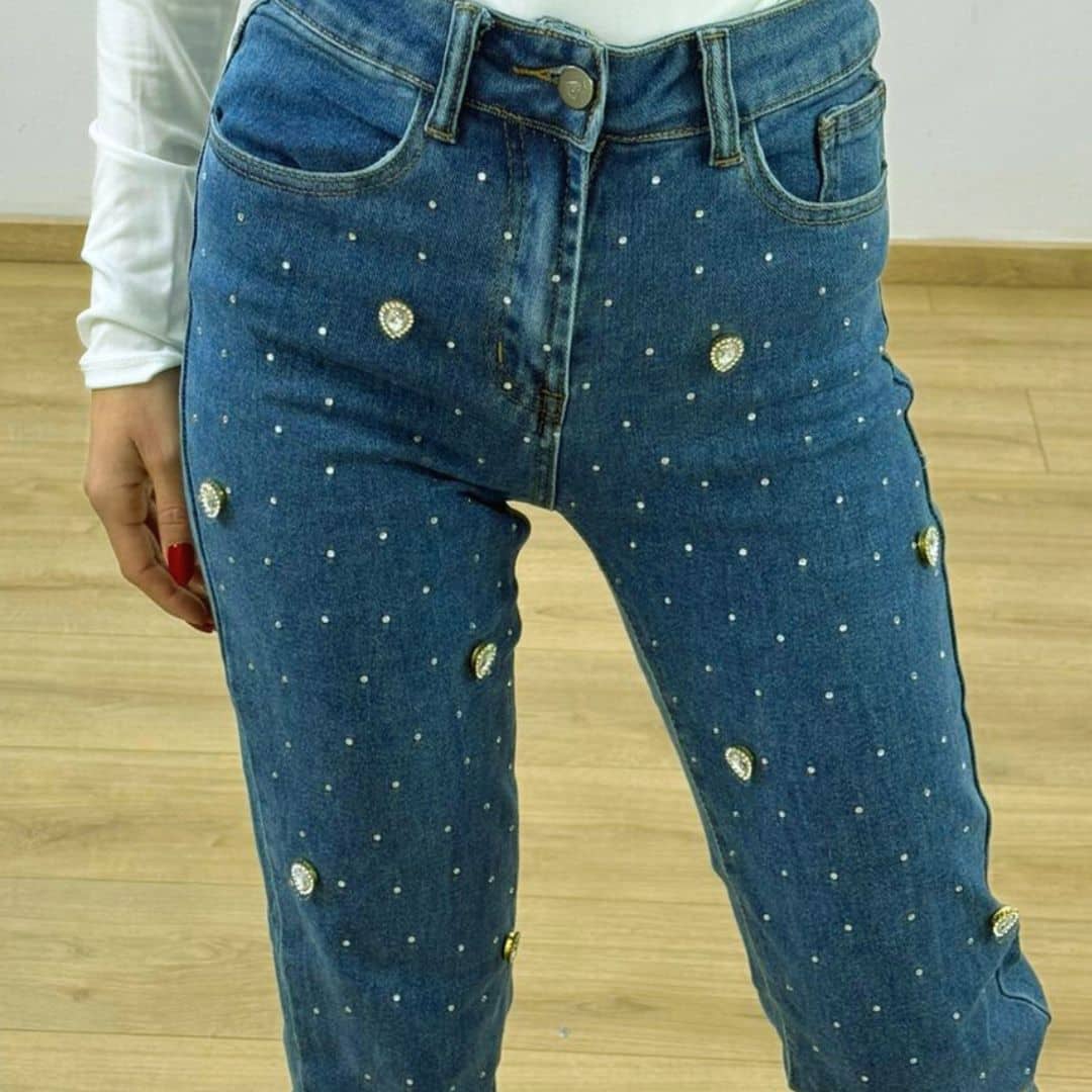 These are high-waisted blue jeans featuring a unique design with scattered pearls and gold-tone button embellishments, adding a luxurious and chic touch. The straight-leg cut and slightly distressed hem enhance their casual yet stylish vibe.