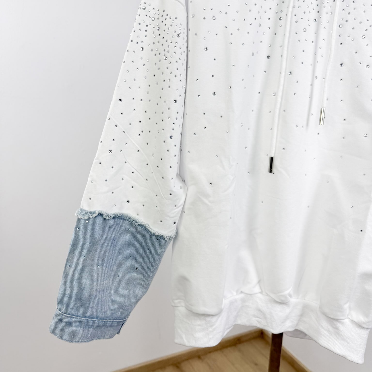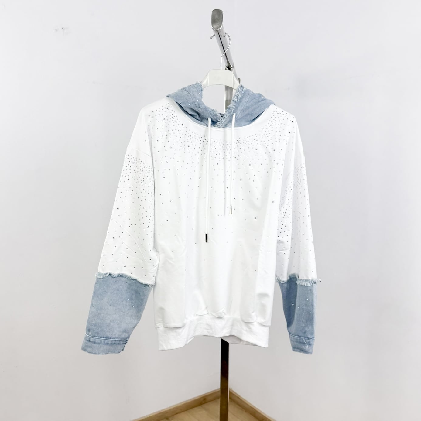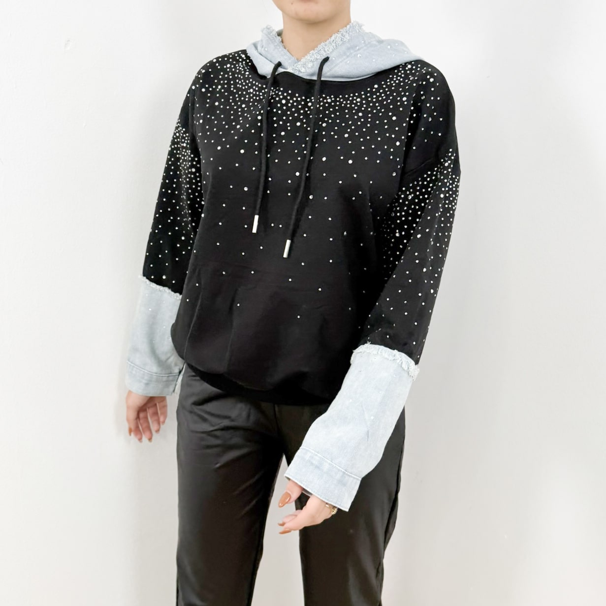 Luxe Sparkle Denim Hoodie – Glam Streetwear with Rhinestone Detail