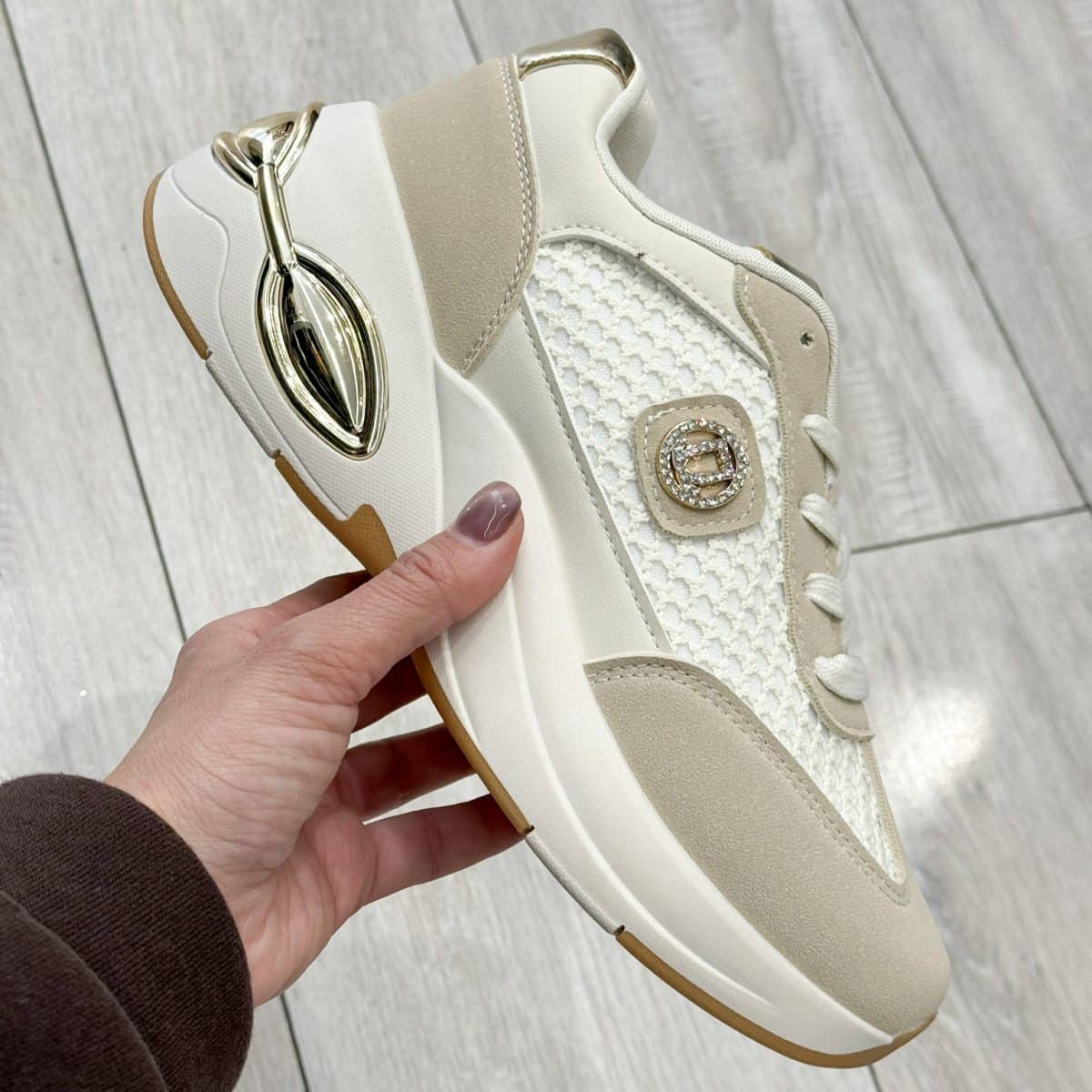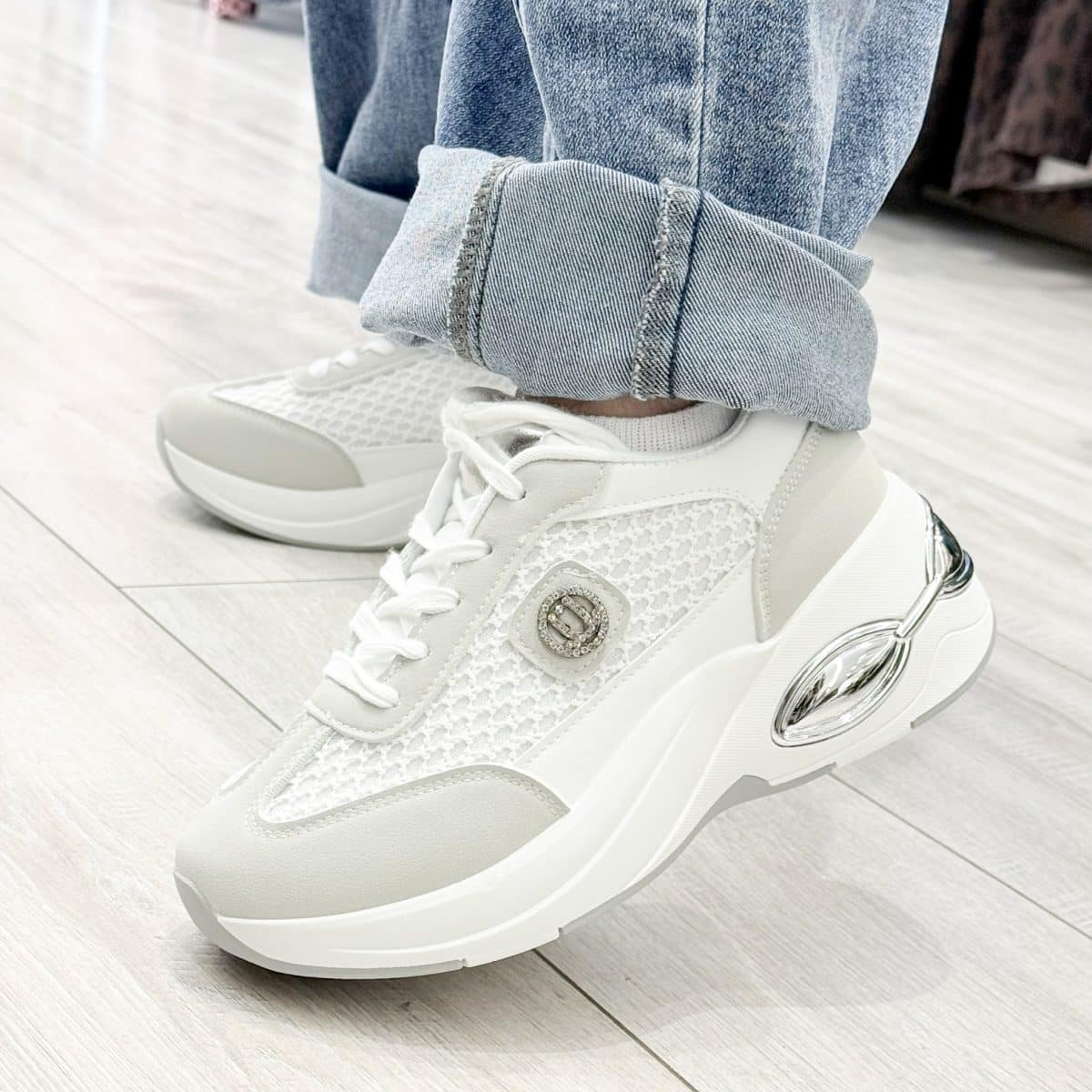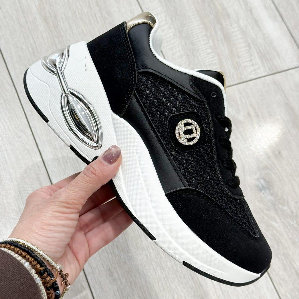 The standout crystal-embellished emblem detail adds a touch of glamour, while the sculpted chunky platform sole enhances height and support. A unique metallic accent at the heel delivers a modern, eye-catching finish, making these sneakers ideal for upgrading everyday casual looks.