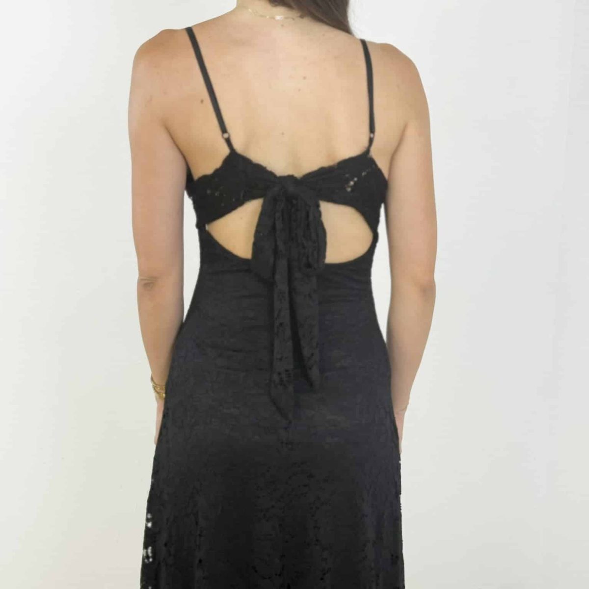 Turn heads with this sultry and romantic lace maxi dress, crafted for warm summer nights and elegant events. Featuring a flattering cowl neckline and delicate spaghetti straps, this dress hugs your silhouette while offering a graceful flow. The back steals the spotlight with a chic open detail and a dramatic bow tie closure.