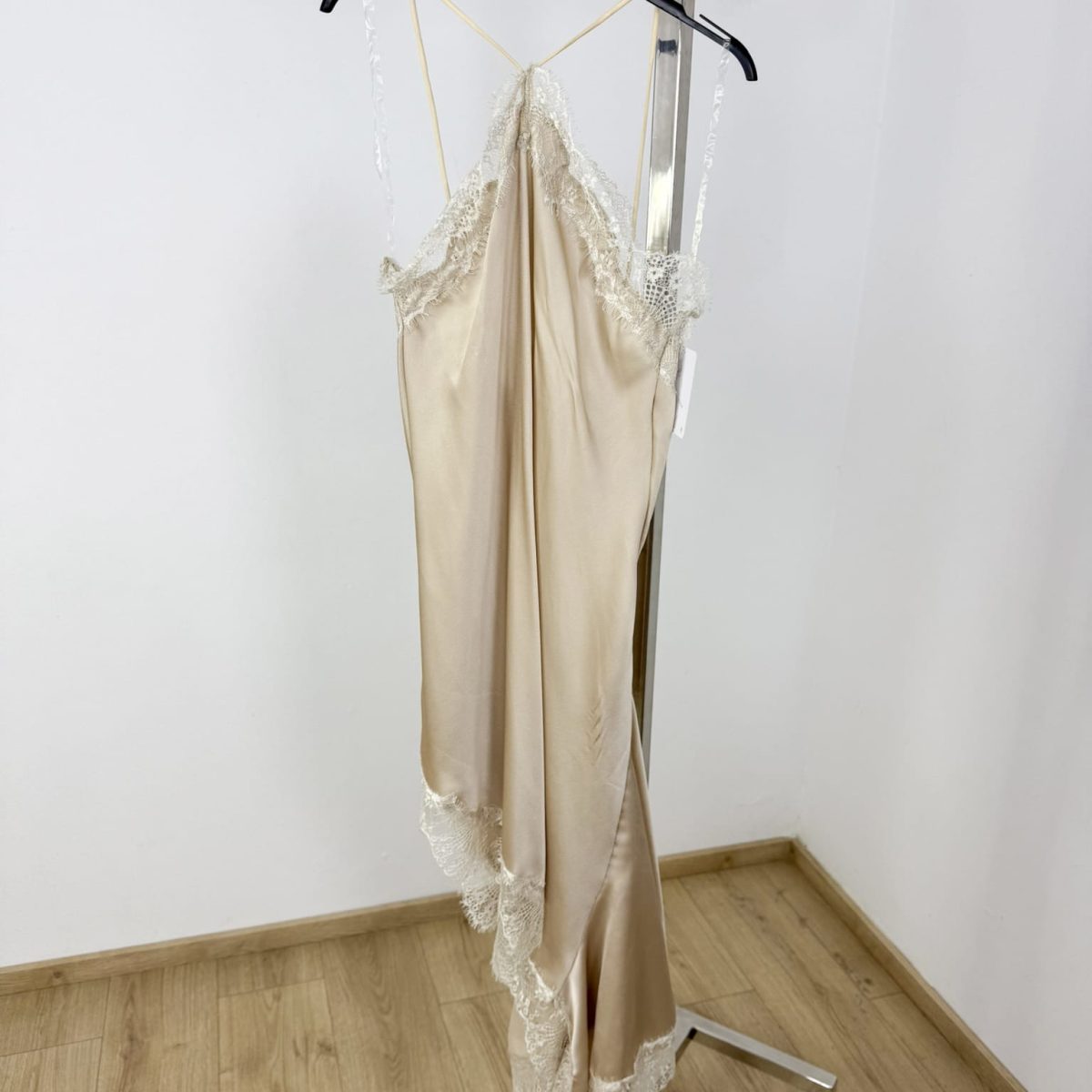 Elevate your evening style with this elegant satin slip dress featuring a delicate halter neckline and soft lace trimming. Its flowing silhouette and asymmetrical hem add a touch of romance, making it perfect for date nights, parties, or any special occasion. Designed for a smooth, luxurious feel and effortless sophistication.