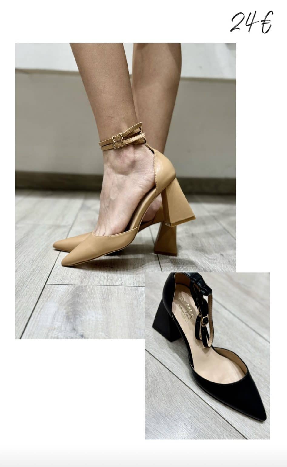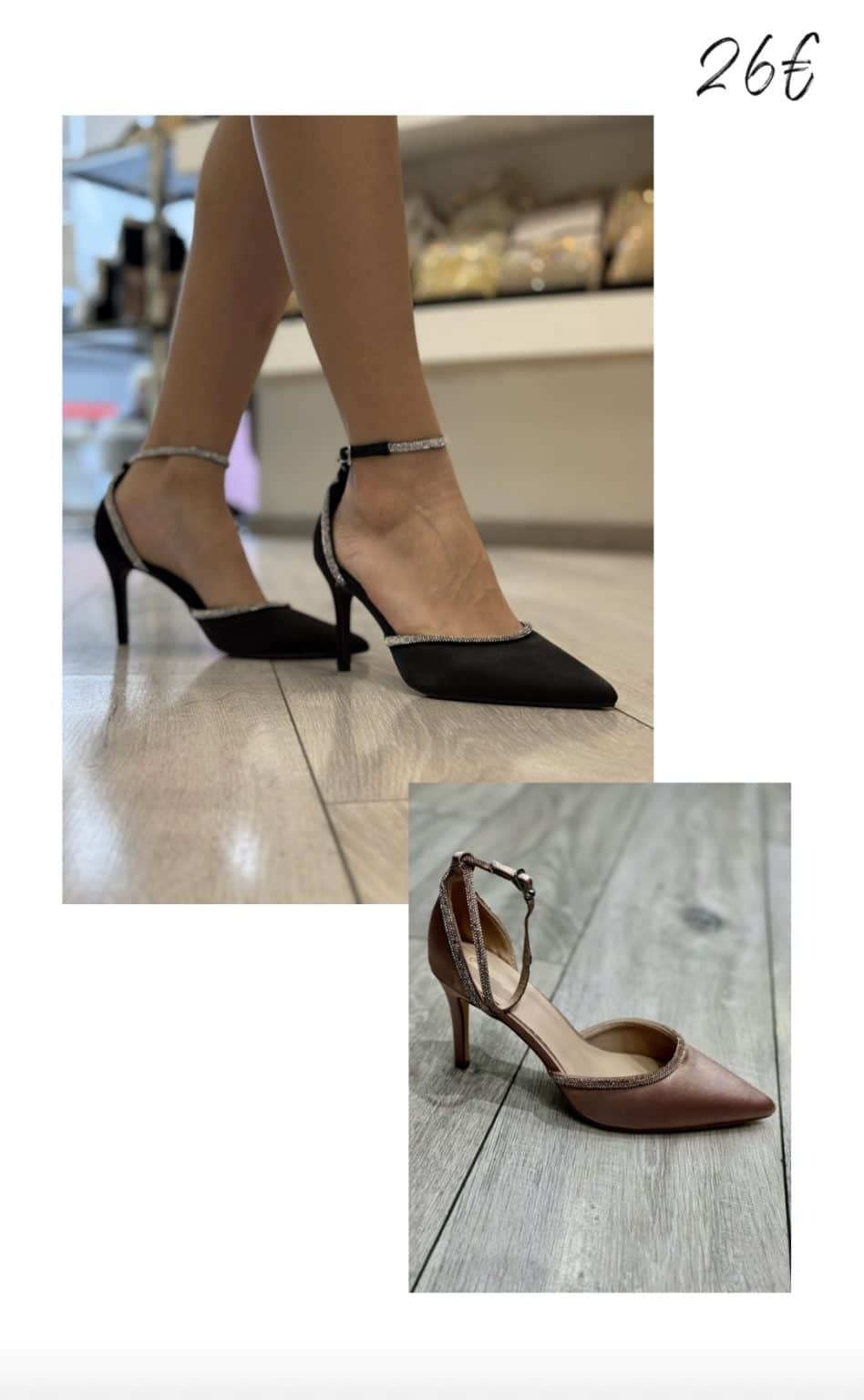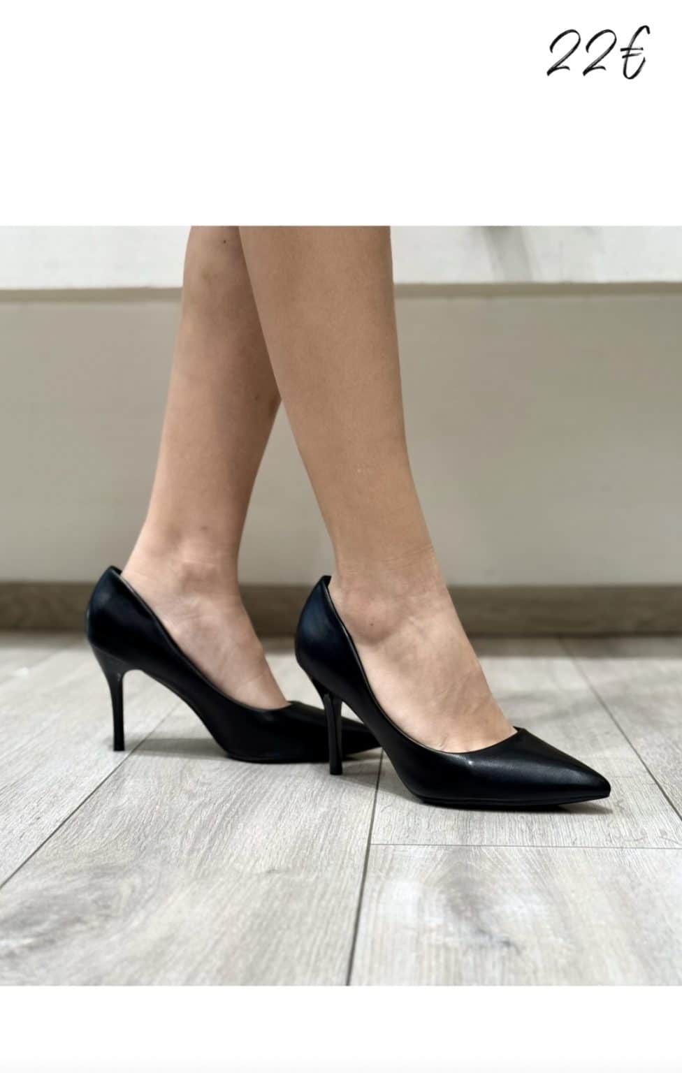 Sleek black pointed-toe heels with a simple ankle strap, balancing elegance and practicality.