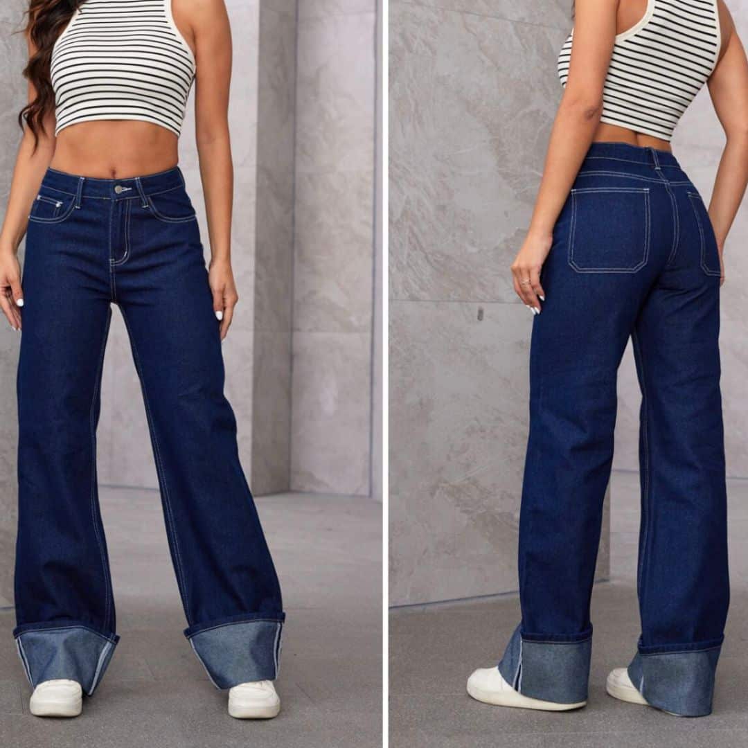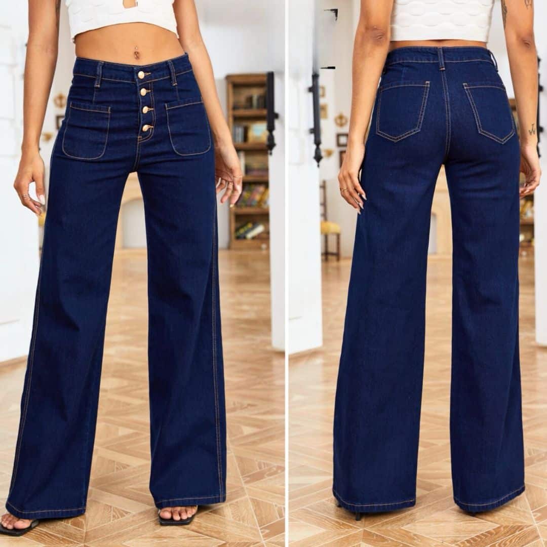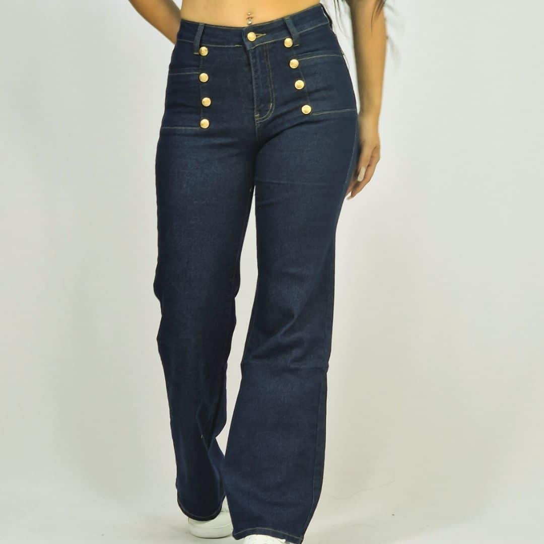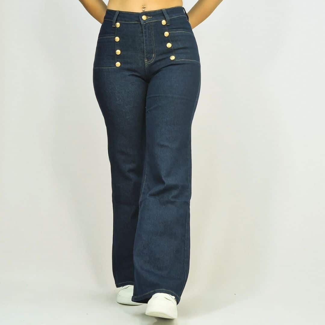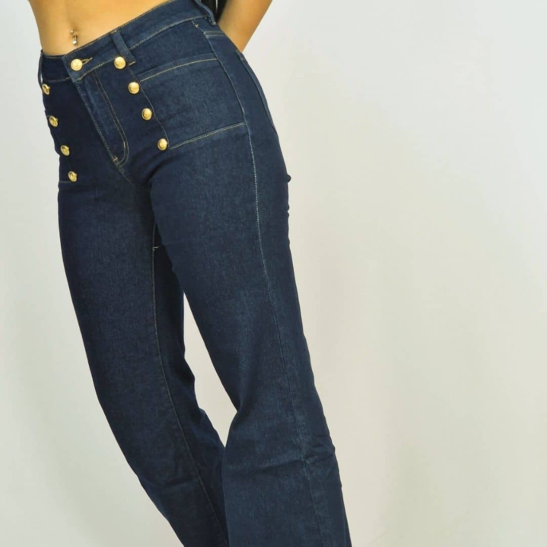 These stylish flare jeans feature a high-waist design adorned with six gold buttons for a nautical-inspired look. Crafted from dark denim, they provide a flattering silhouette with a retro vibe, perfect for a trendy yet comfortable fit. Ideal for both casual and dressy outfits, these jeans are sure to make a statement.