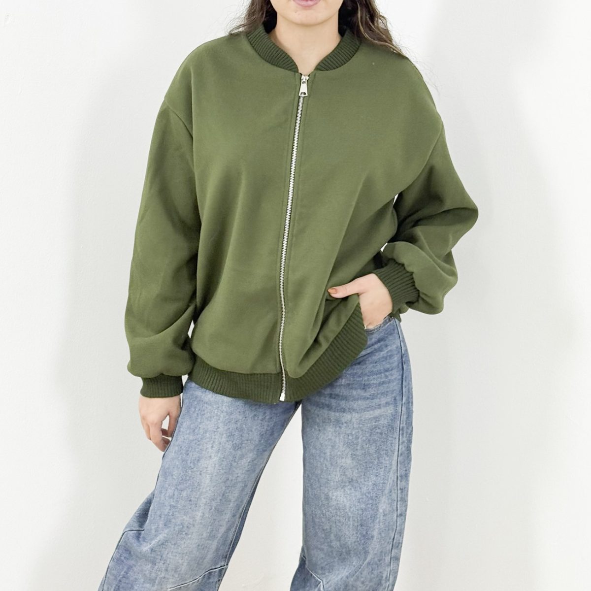 The Oversized Zip Bomber Jacket features a smooth zip-up front, ribbed cuffs and hem, and a soft-touch fabric that keeps you warm without sacrificing breathability. Its minimalist design makes it a versatile essential that pairs easily with jeans, joggers, or dresses — ideal for everyday wear, travel, or casual outings.