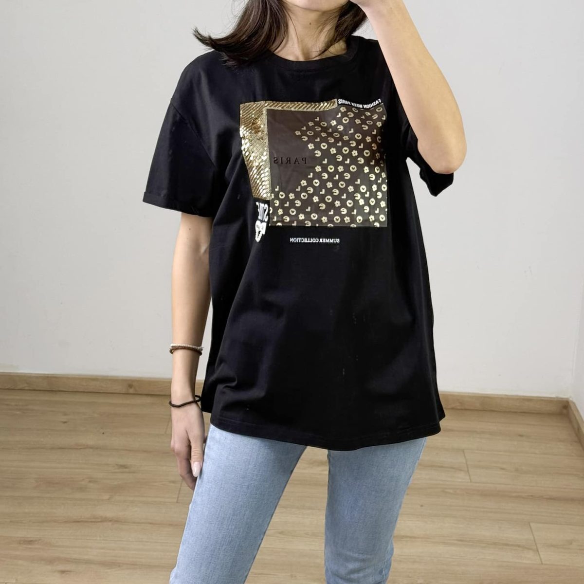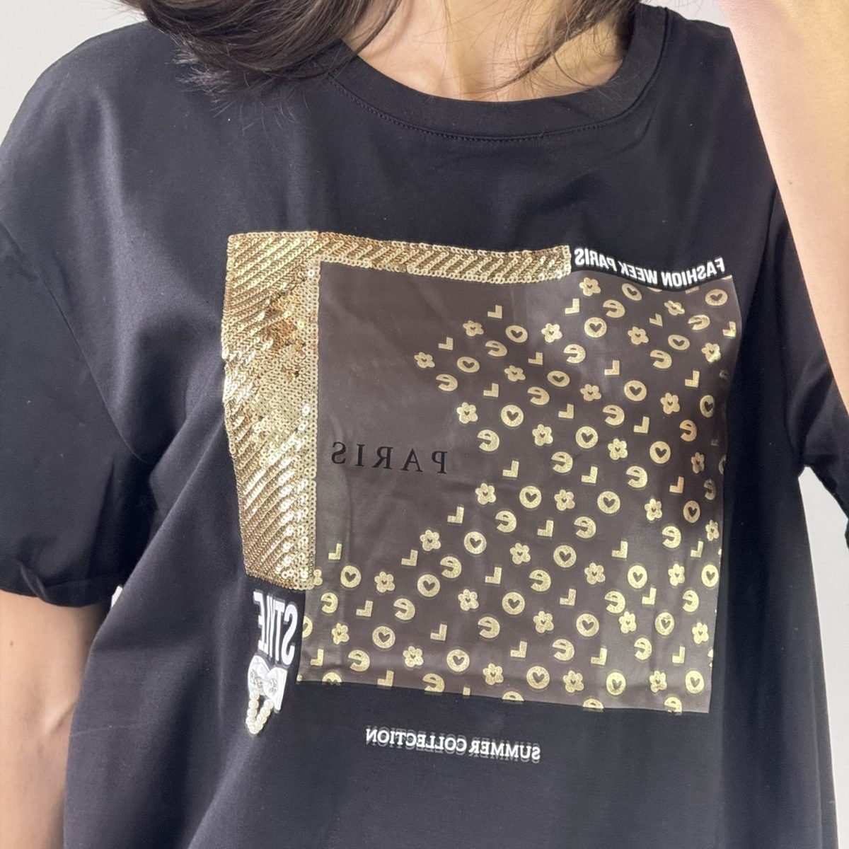 A stylish and trendy oversized t-shirt featuring a chic Paris-inspired graphic with gold sequin embellishments. Made from soft, breathable fabric, this tee combines casual comfort with a touch of elegance. Available in classic black and white, it pairs perfectly with jeans or leggings for a fashionable everyday look.