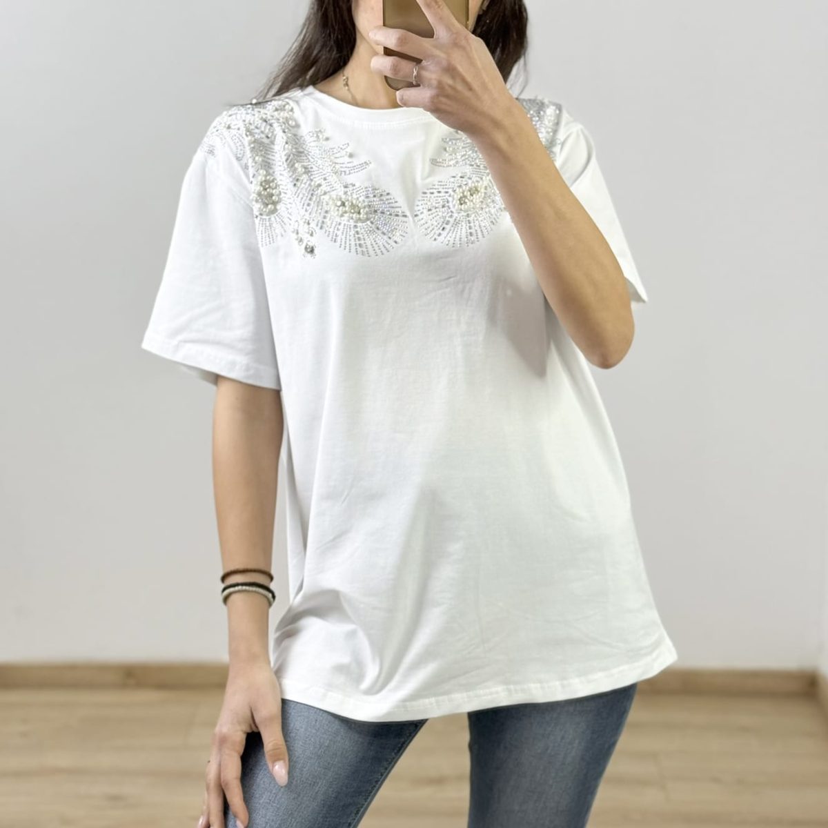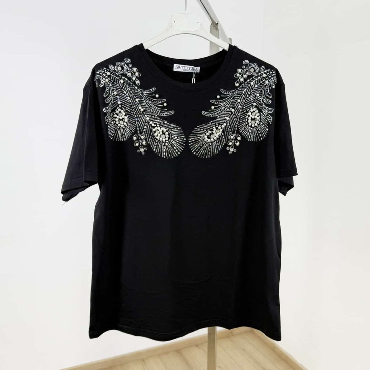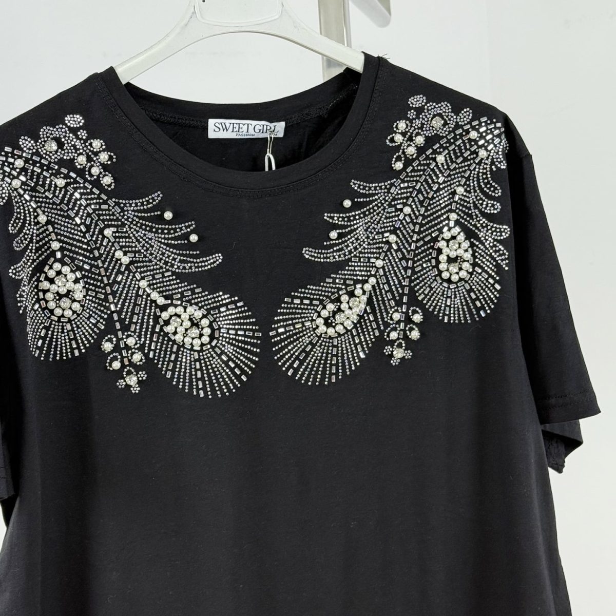 Elevate your everyday look with the Pearl Deco Luxe Tee — a timeless, oversized cotton T-shirt adorned with intricate pearl and rhinestone embellishments in a dazzling feather motif. Soft, breathable, and effortlessly chic, this standout piece is perfect for both casual and semi-formal styling. Available in classic white and bold black for versatile elegance.