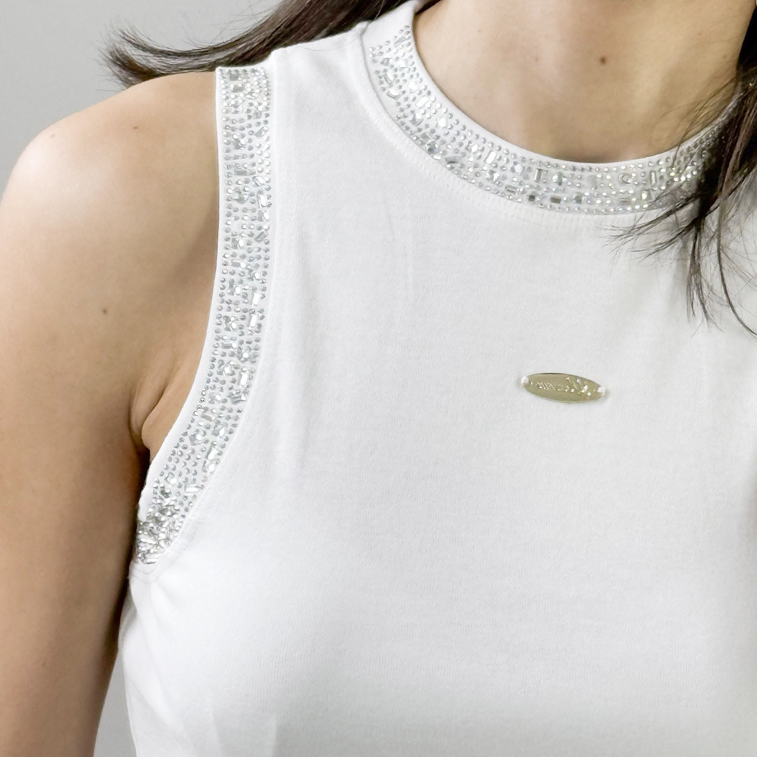 A sleek and sophisticated sleeveless top featuring shimmering rhinestone embellishments along the neckline and armholes for a touch of elegance. Designed with a high-neck cut and a slim fit, this top is perfect for both casual and dressy occasions. Available in classic black and white, it pairs effortlessly with jeans, skirts, or tailored pants for a chic and polished look.