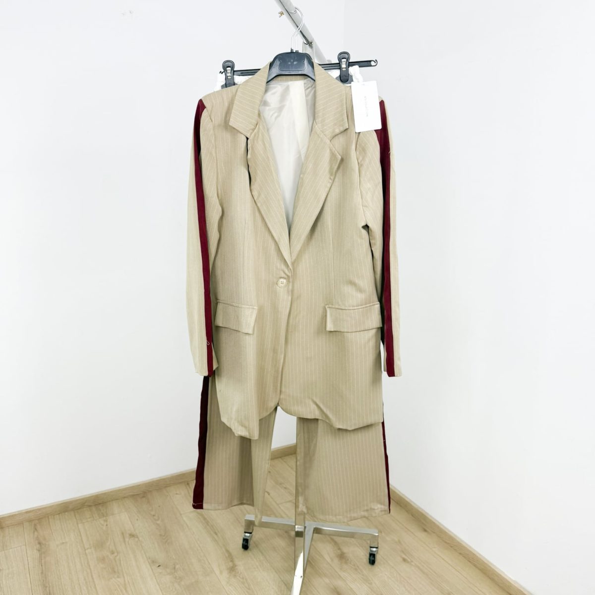 Elevate your style with the Pinstripe Statement Suit Set. This two-piece ensemble features a double-breasted blazer with bold maroon stripe detailing along the sleeves and matching high-waisted wide-leg trousers. Available in versatile black and rich camel hues, the set offers an effortlessly tailored fit with a modern, relaxed vibe. Perfect for both power dressing and casual sophistication, this standout suit is ideal for making an impression anywhere, anytime.