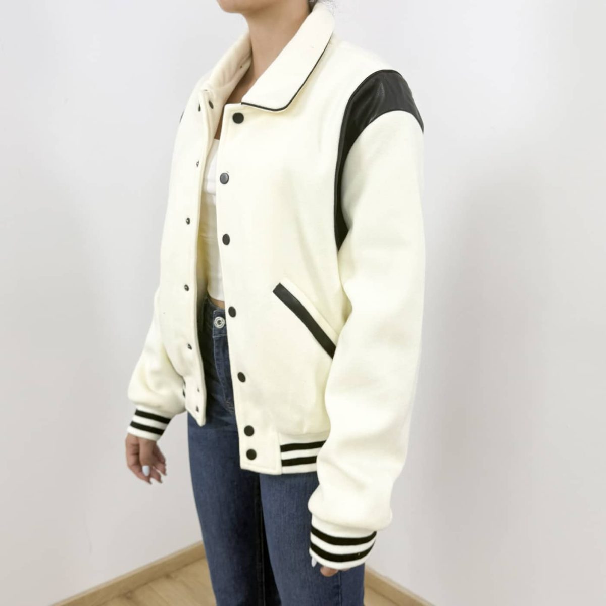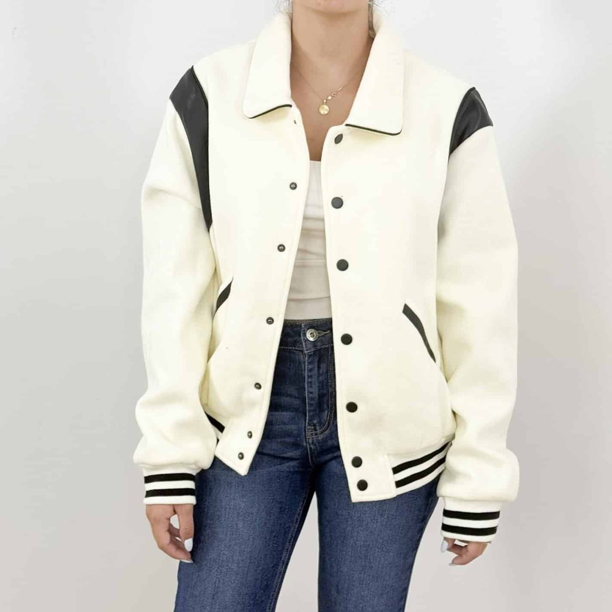 Pair the Power Varsity Jacket with ripped jeans, a plain white tee, and sneakers for a casual streetwear vibe. For a more elevated look, layer it over a fitted dress with ankle boots.