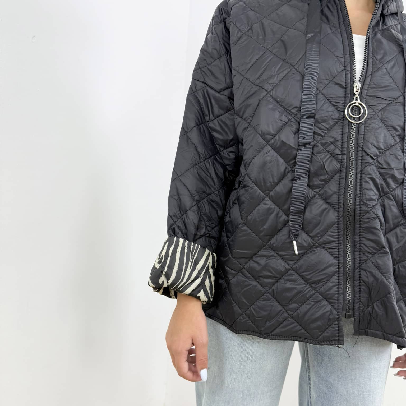 Stay chic and cozy with this quilted hooded jacket featuring a modern twist. Designed with diamond stitching, a practical zip closure, and bold zebra-print cuffs, this piece perfectly blends classic and trendy. Lightweight yet stylish, it’s the ultimate outerwear for layering through transitional seasons.