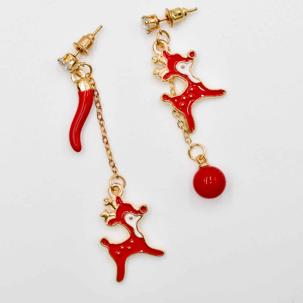 Bring cheerful holiday vibes to every outfit with these Red Reindeer Mismatched Christmas Drop Earrings. Featuring playful enamel reindeer charms in bright festive red, paired with a dangling red bead and a fun chili-style accent, this adorable duo adds the perfect touch of Christmas magic. Lightweight, eye-catching, and ideal for parties, gifting, or festive everyday wear throughout the season.