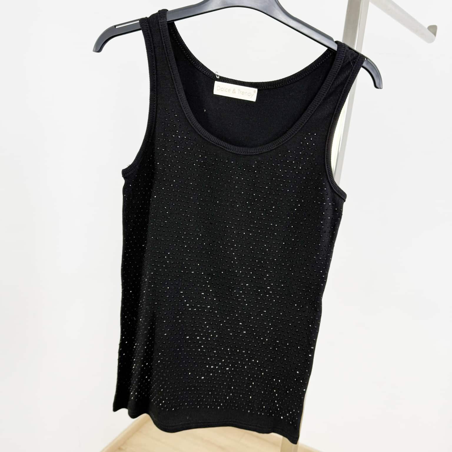 Add a touch of sparkle to your everyday wardrobe with this ribbed tank top featuring all-over rhinestone detailing. Crafted from a soft, stretchy knit fabric, it hugs the body comfortably while offering just the right amount of shine. With its scoop neckline and sleeveless design, this top is perfect for layering or standing out on its own — whether you’re going casual or dressing up for a night out.