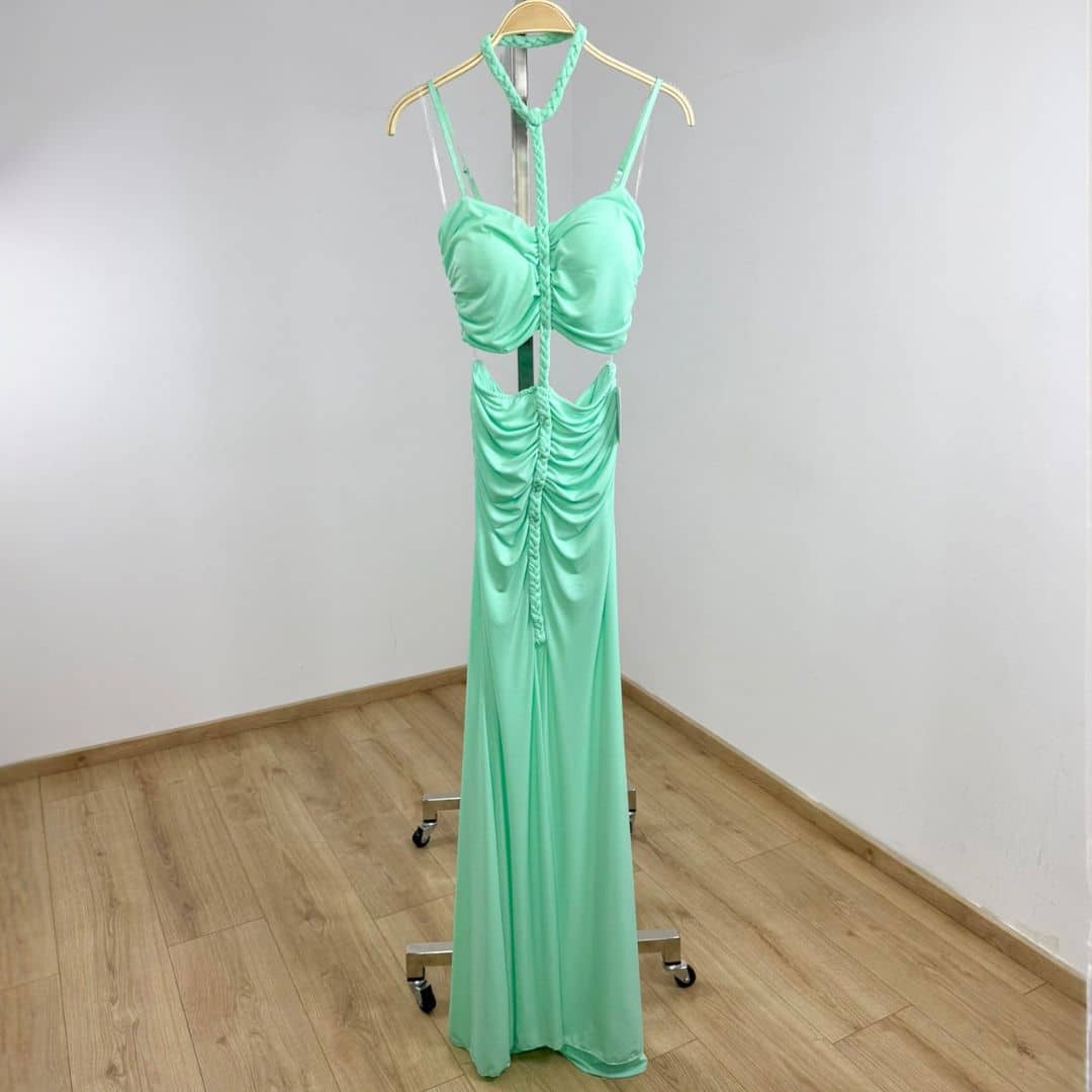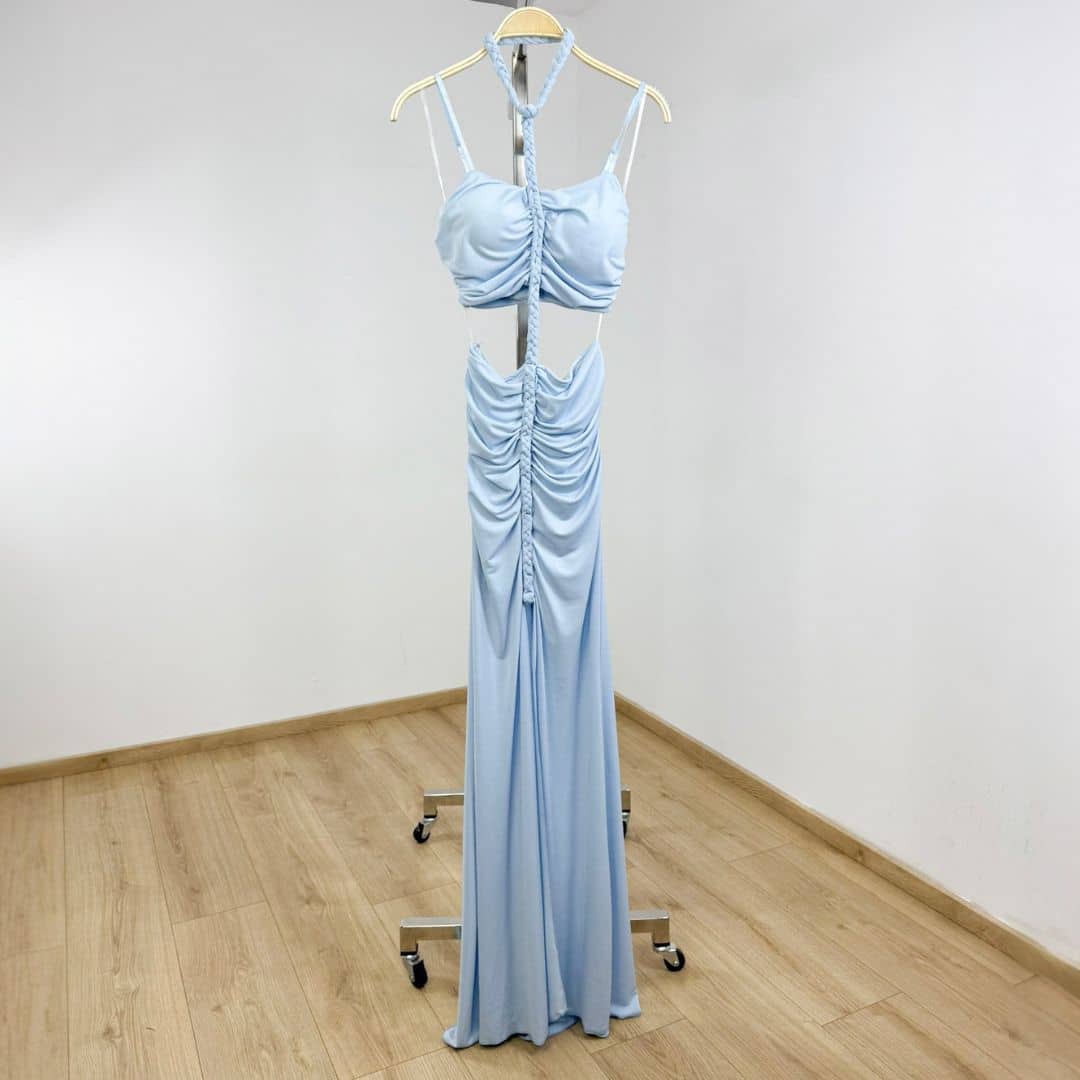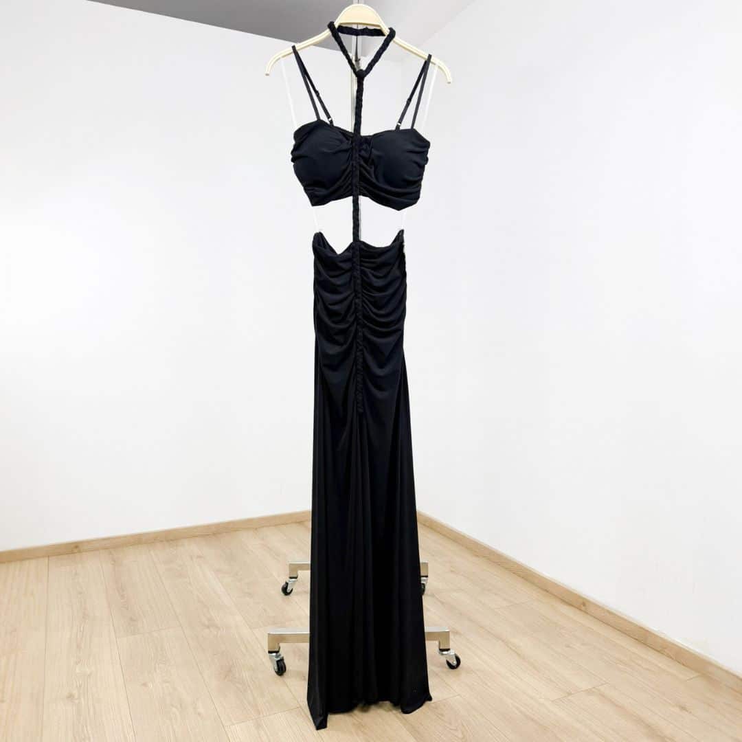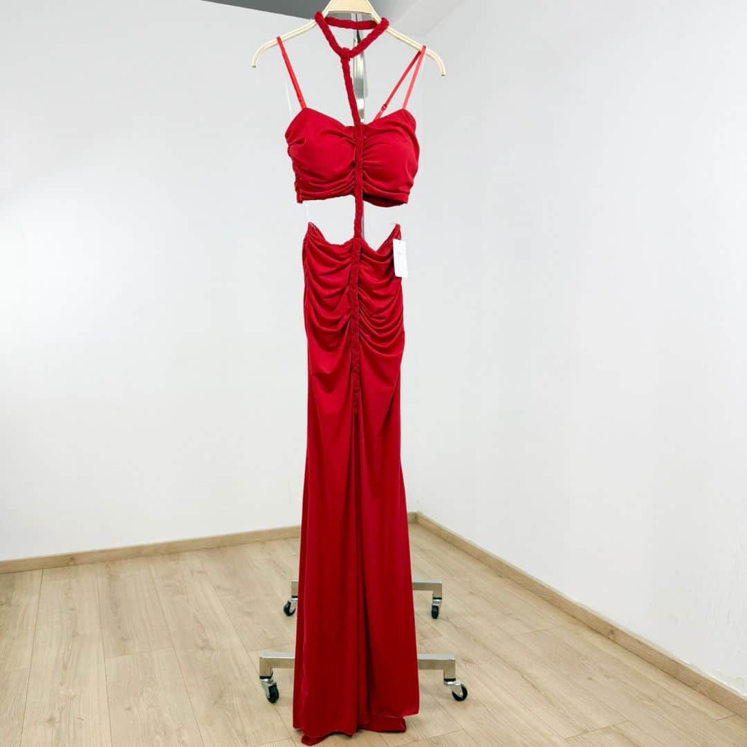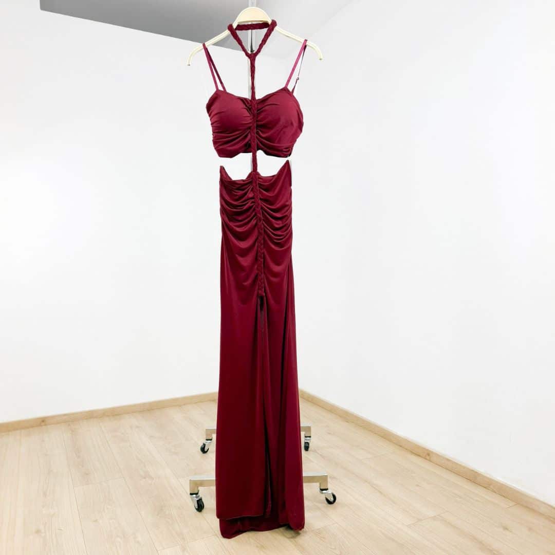 Step into the spotlight with this daring ruched cut-out maxi dress, designed with a body-hugging silhouette that accentuates every curve. Featuring a halter neckline with a braided detail, gathered ruching along the front, and a striking midriff cut-out, this dress makes a bold statement. The high front slit adds just the right amount of edge, perfect for parties, club nights, or summer evenings out.