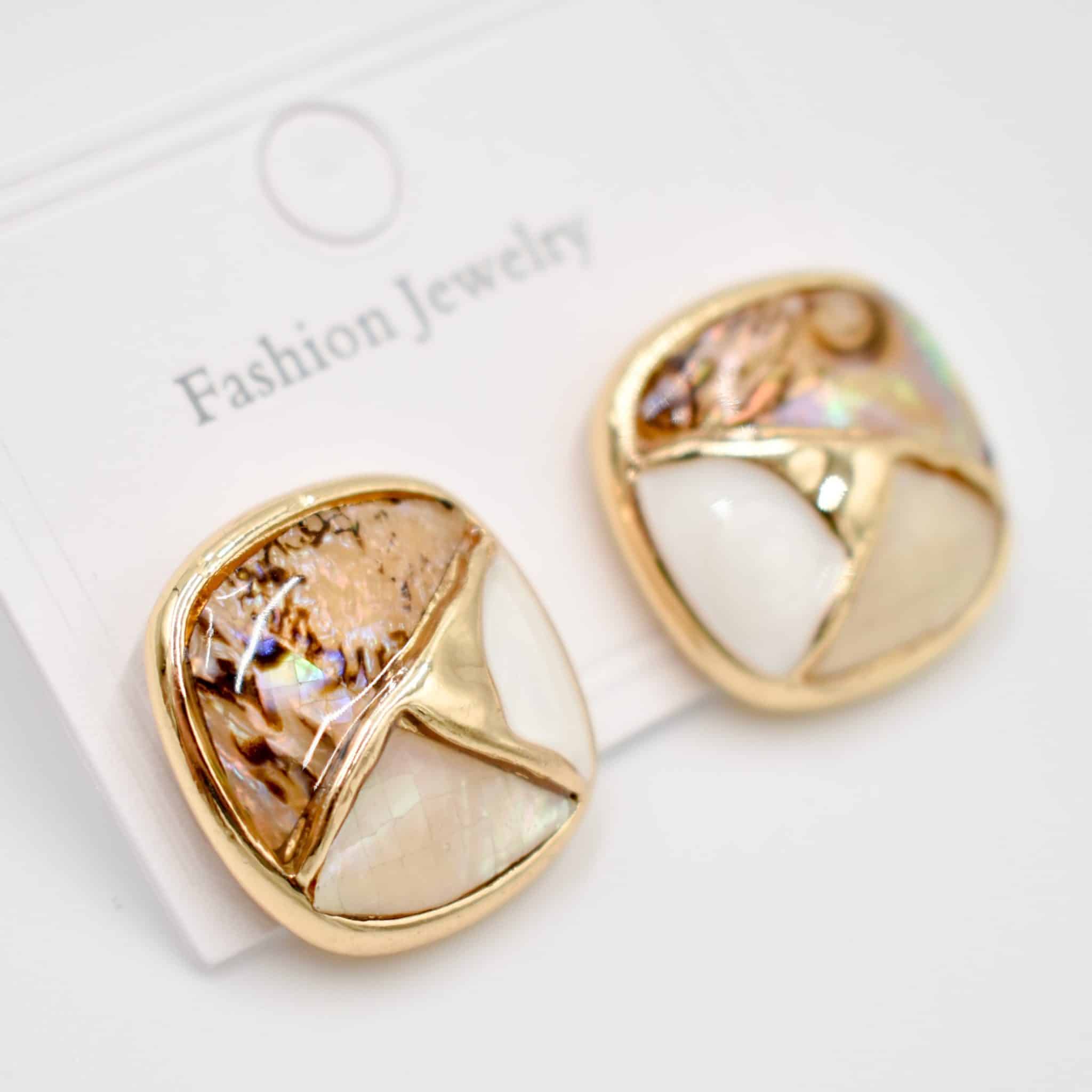 Bring natural elegance to your summer look with these stunning seashell mosaic stud earrings. Designed with a blend of iridescent shell, pearly white, and beige accents set in a modern square gold frame, these earrings echo the beauty of sunlit coastal landscapes.
