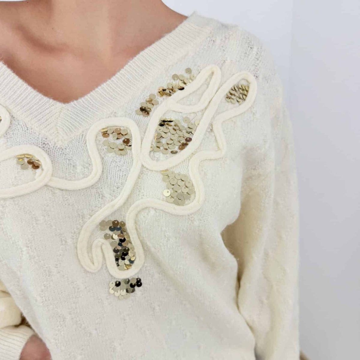 Add sparkle to your everyday wardrobe with this elegant knit sweater featuring sequin embellishments. Designed with a flattering V-neckline and soft knit texture, it combines comfort with a touch of glam. Perfect for casual chic looks or evening layering, this sweater is a versatile piece that elevates your style.