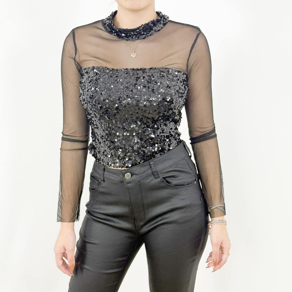 The Sequin Mesh Top offers a sophisticated silhouette with a high mock neckline, long transparent sleeves, and a body-hugging fit that flatters your shape beautifully. Its refined yet daring design makes it ideal for special occasions, parties, or an elegant night out.