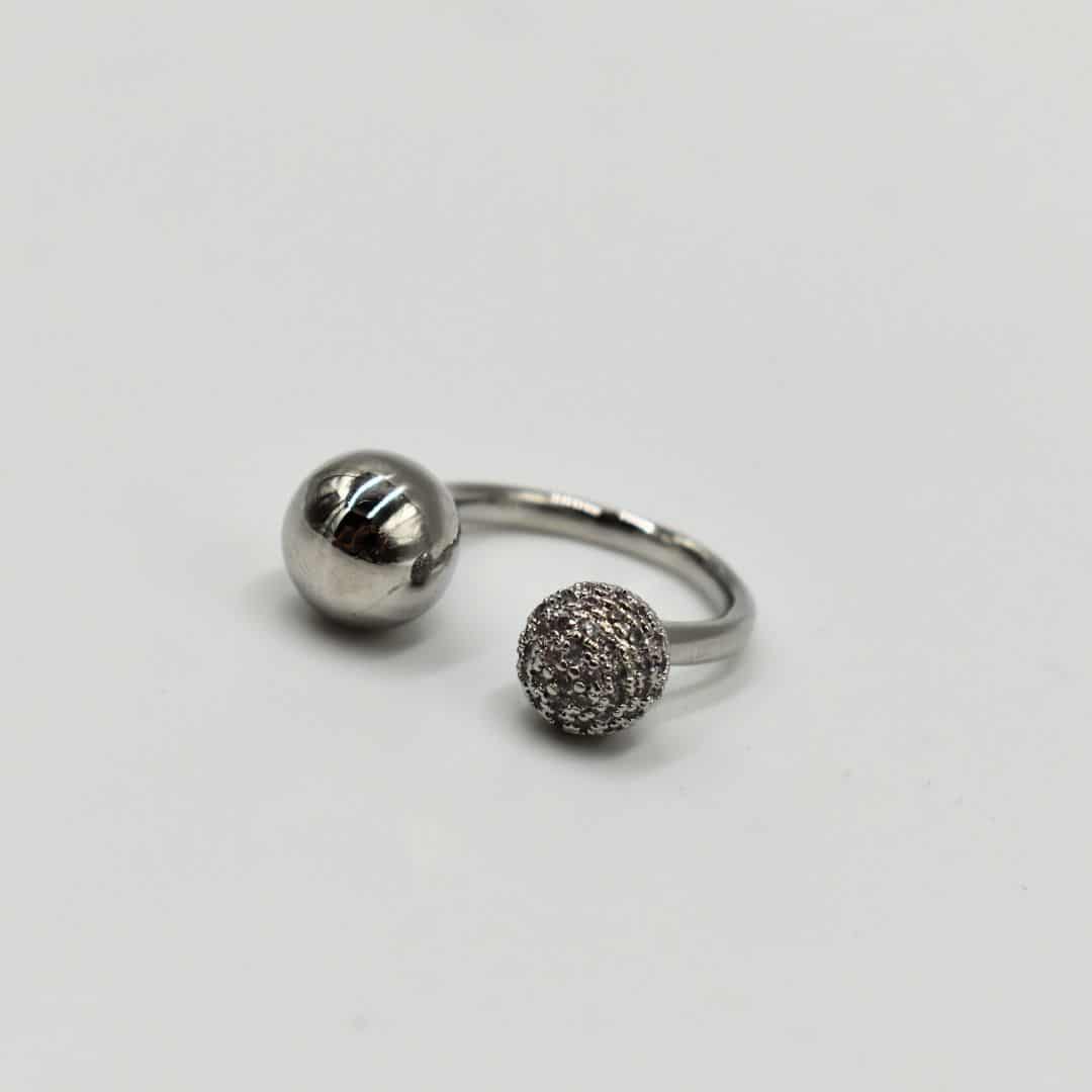 A stylish silver open ring featuring two ball ends, one smooth and polished, the other textured with shimmering pave stones. Its minimal yet modern design makes it perfect for casual or formal occasions.