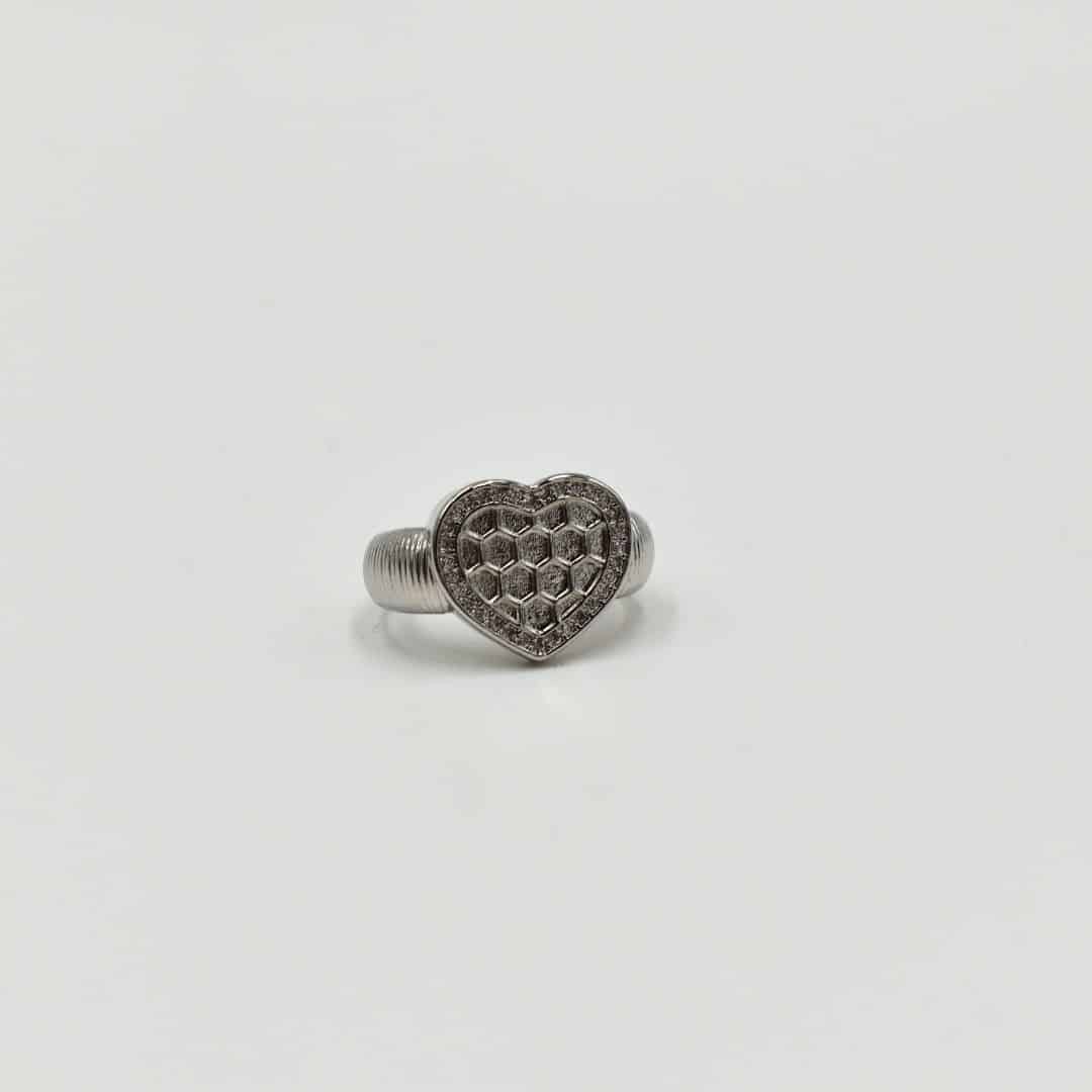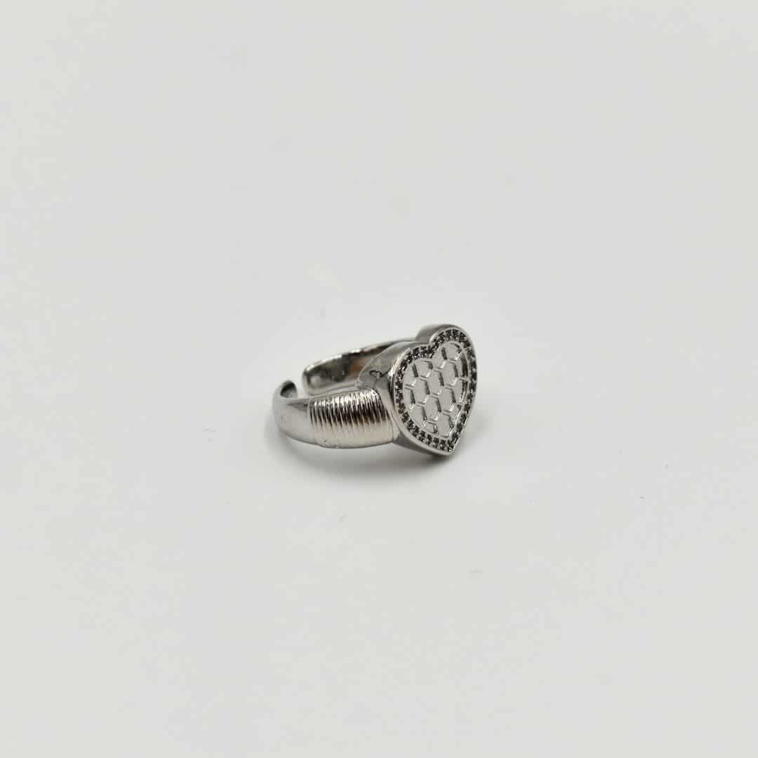 A striking silver ring with a heart-shaped centerpiece featuring a unique honeycomb pattern. The heart is bordered by a row of sparkling stones, adding a touch of elegance to this bold and playful design. Perfect for those who love modern, geometric accents.
