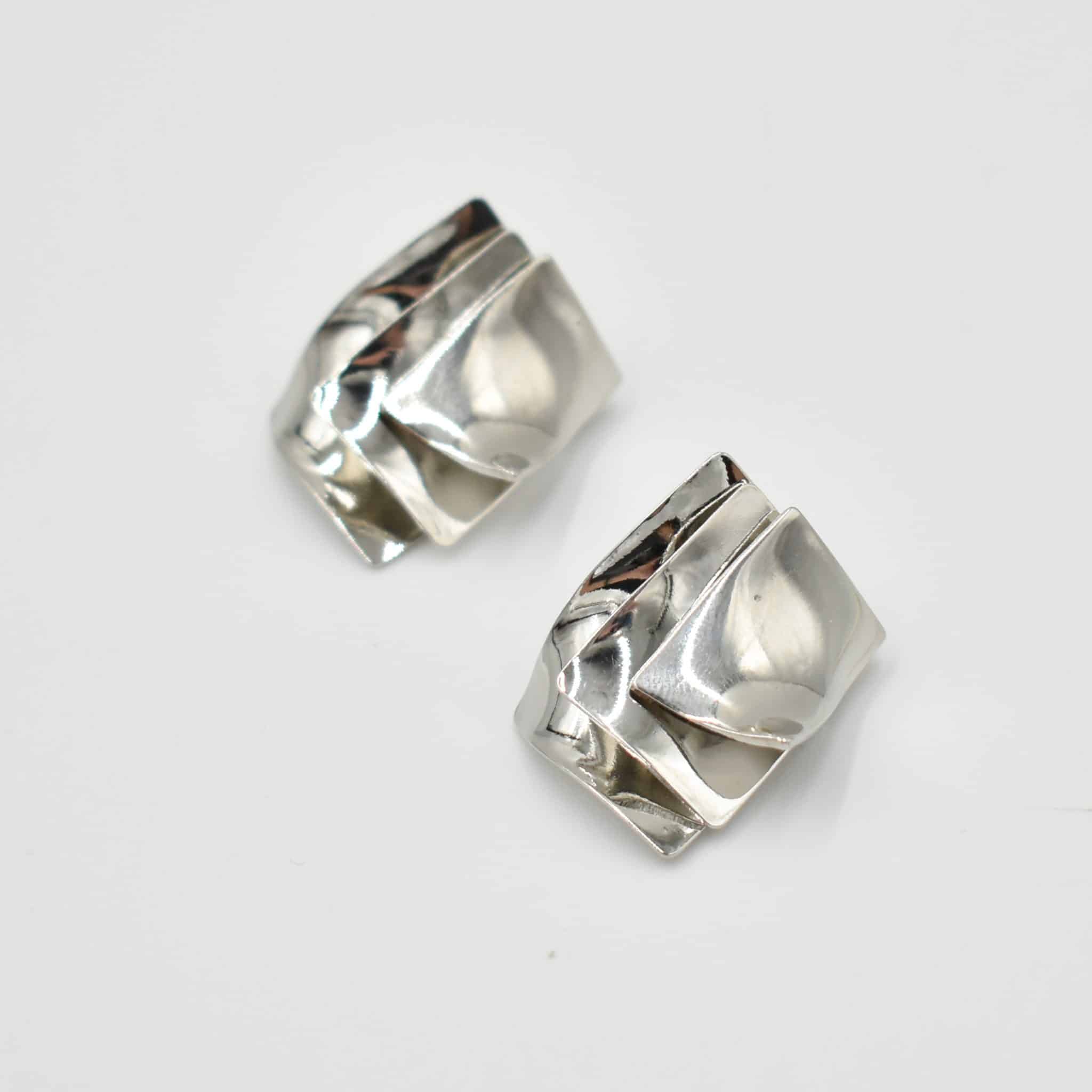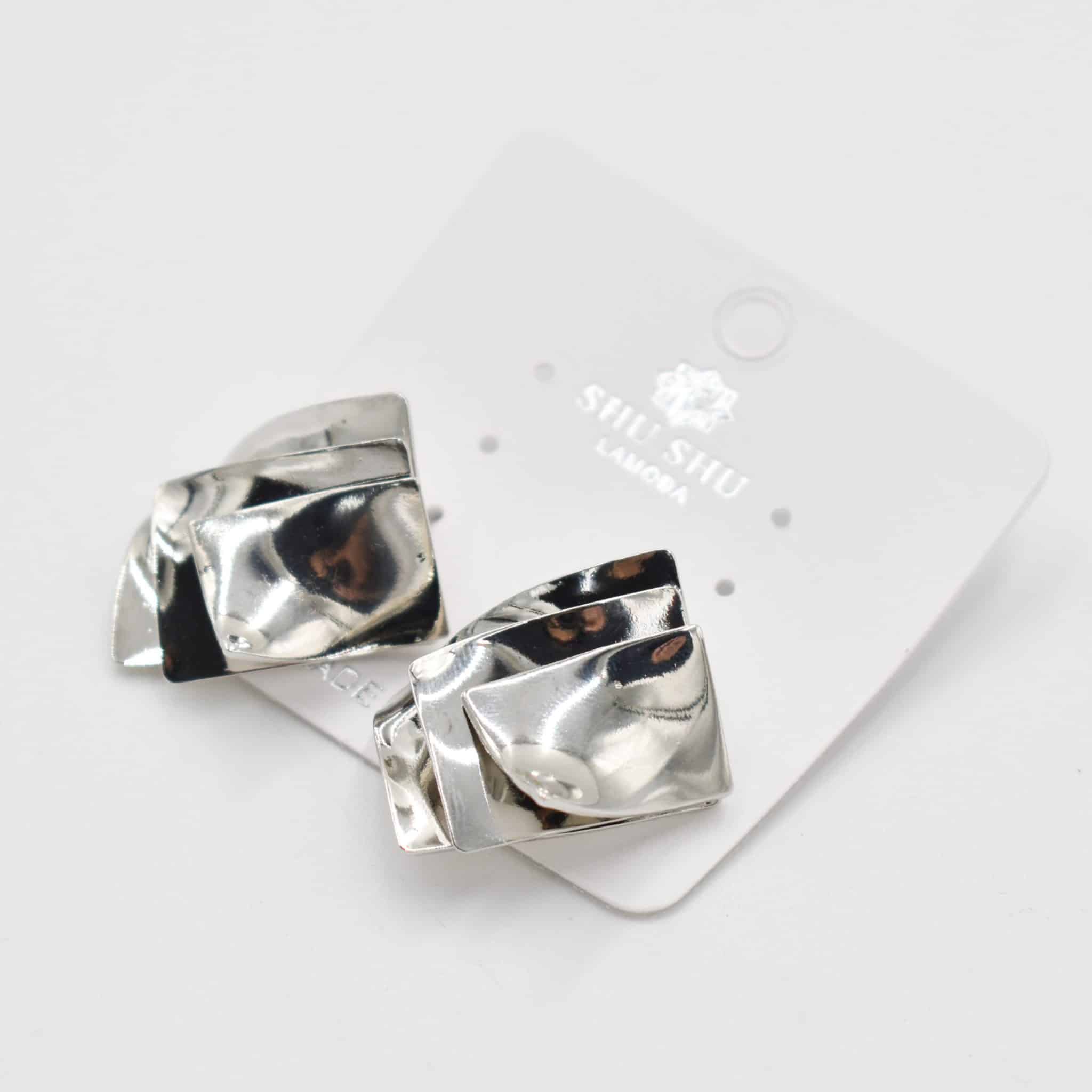 Modern and sleek, these metallic silver studs feature a folded design that reflects light and catches the eye with every movement.
