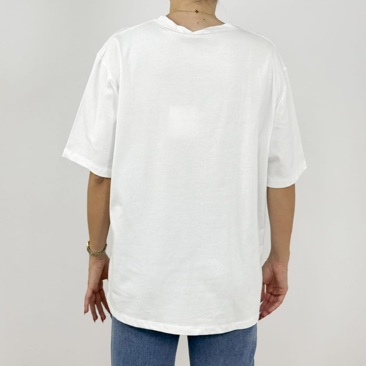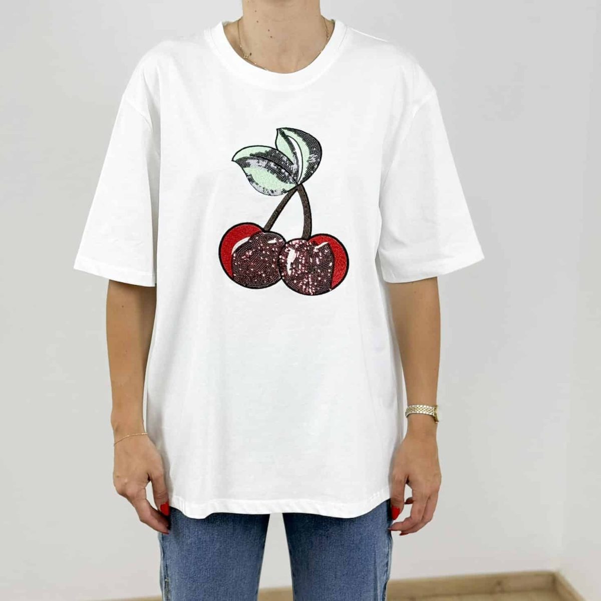 Bring a playful pop to your summer wardrobe with this oversized white tee featuring a sequin cherry motif. Effortlessly cool and fun, it combines comfort with statement sparkle for easy everyday styling.