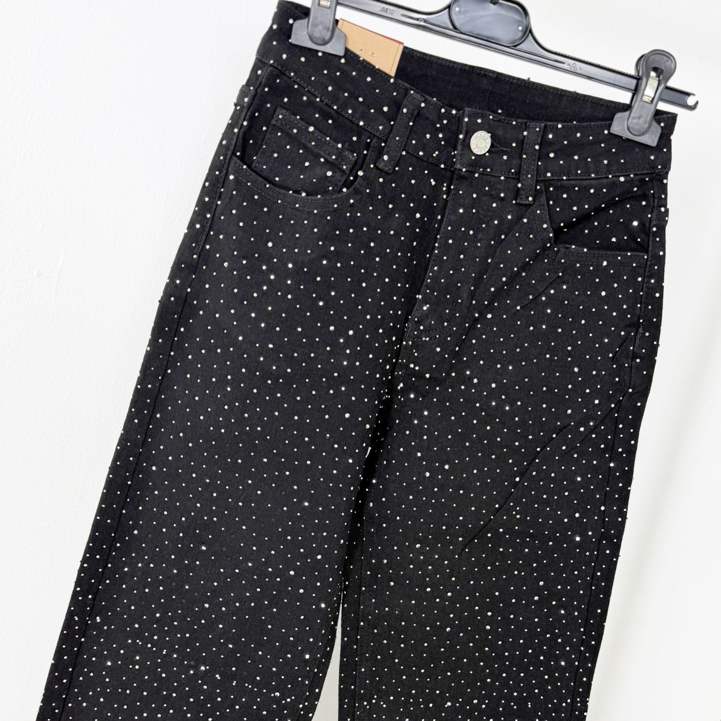 Elevate your denim game with these high-waisted, straight-leg jeans adorned in sparkling rhinestones. Style them solo or pair them with the matching cropped jacket to create a complete glittering denim set.