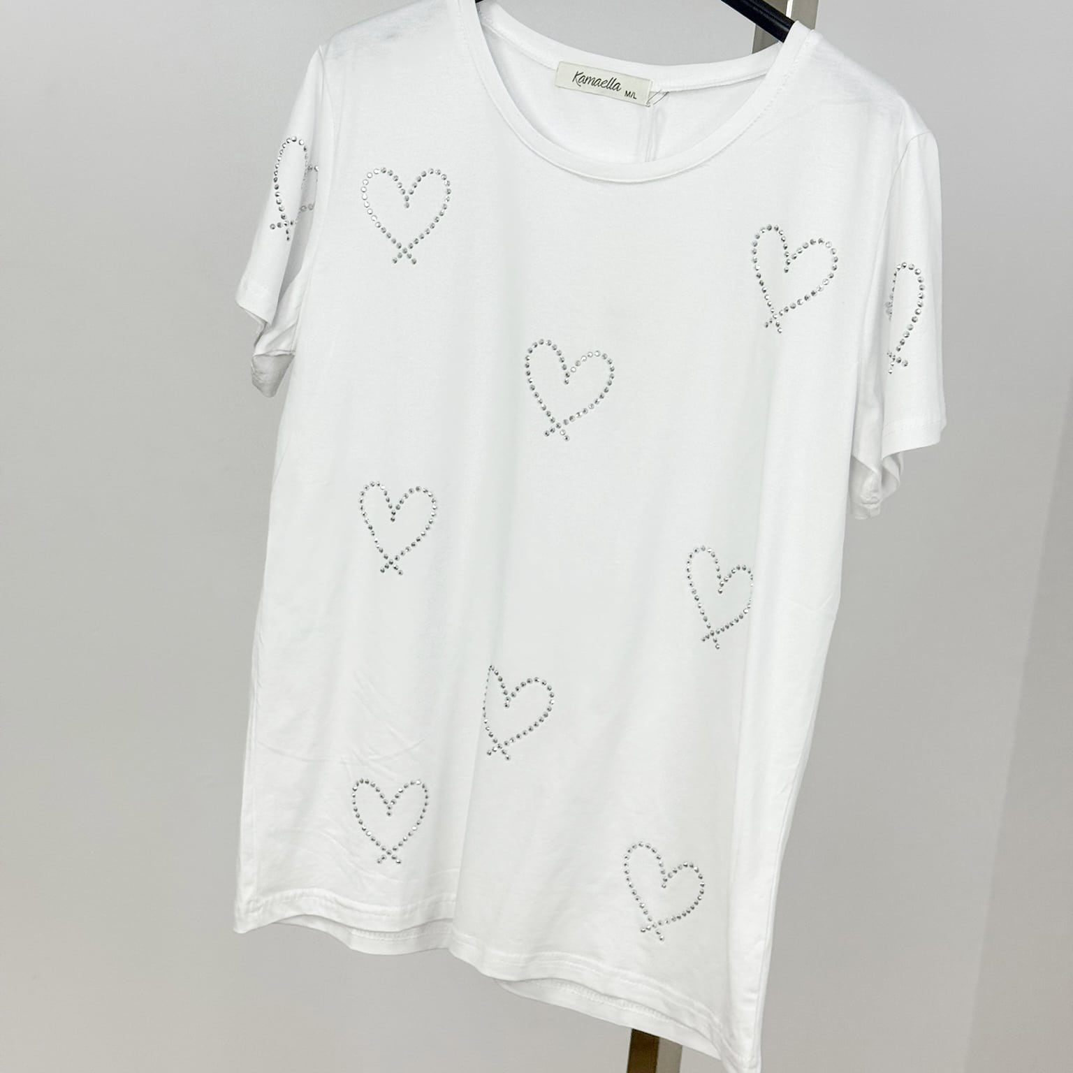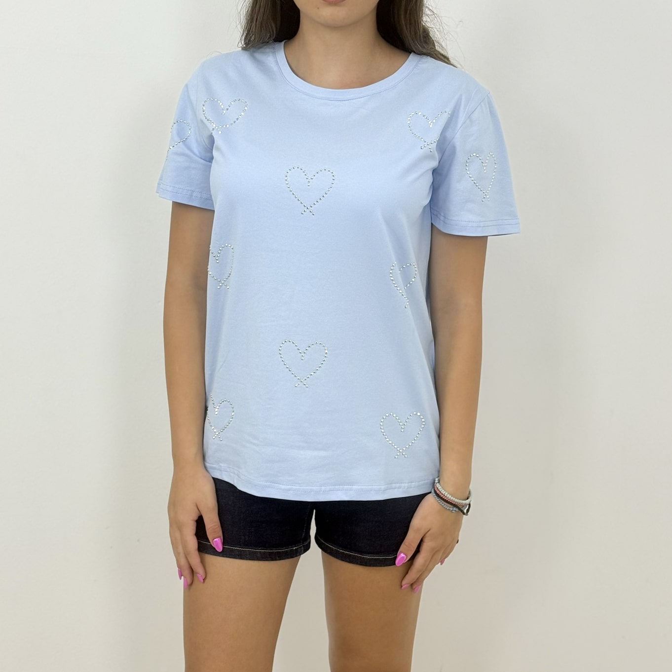 This short-sleeve cotton tee features delicate rhinestone heart patterns, adding a playful sparkle to your everyday summer looks. Its soft, breathable fabric and classic crew neckline make it the perfect choice for effortless styling.