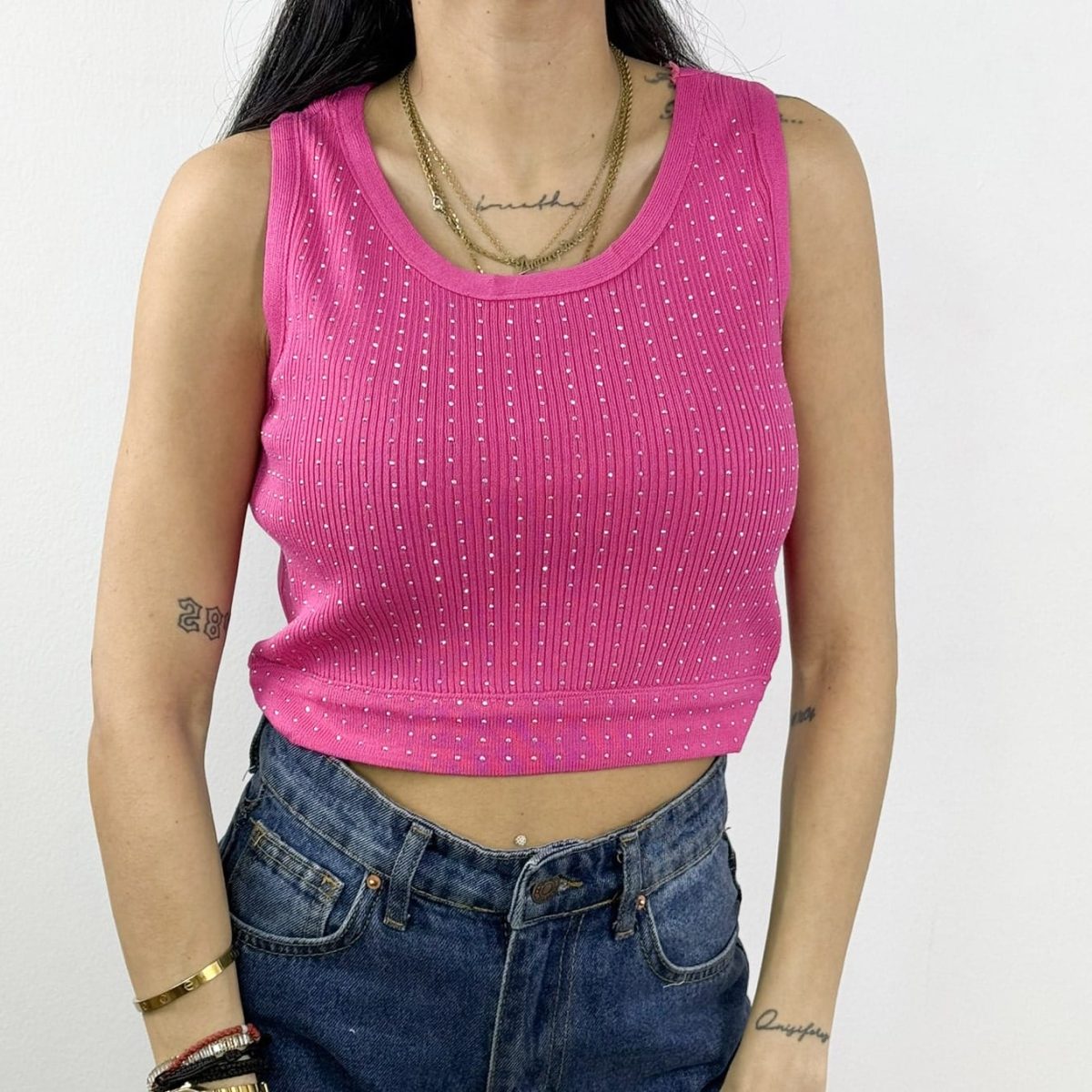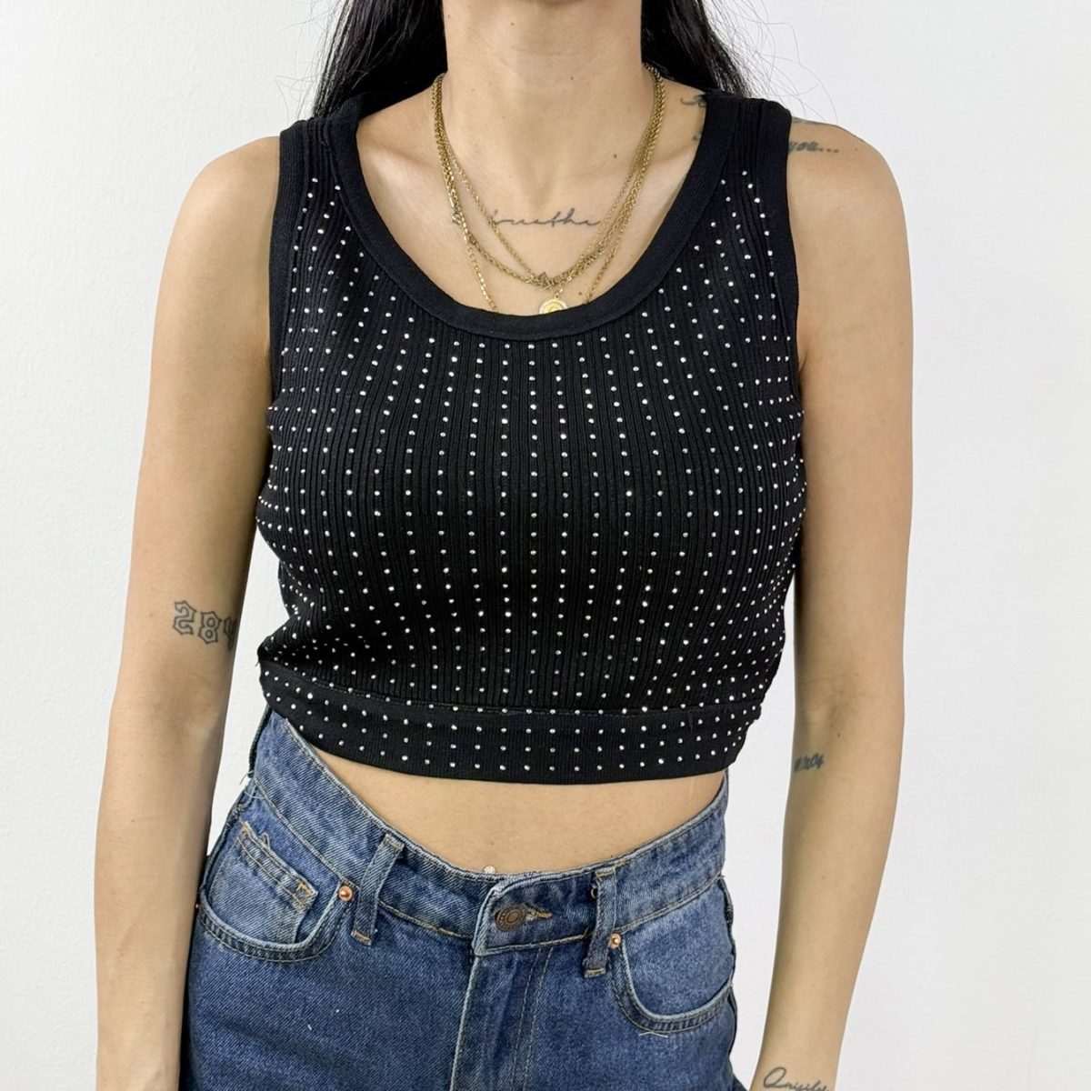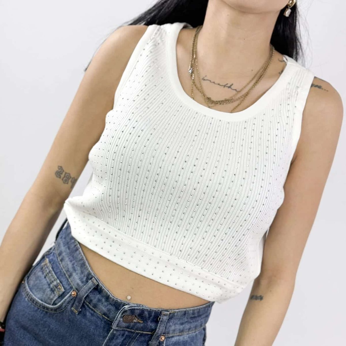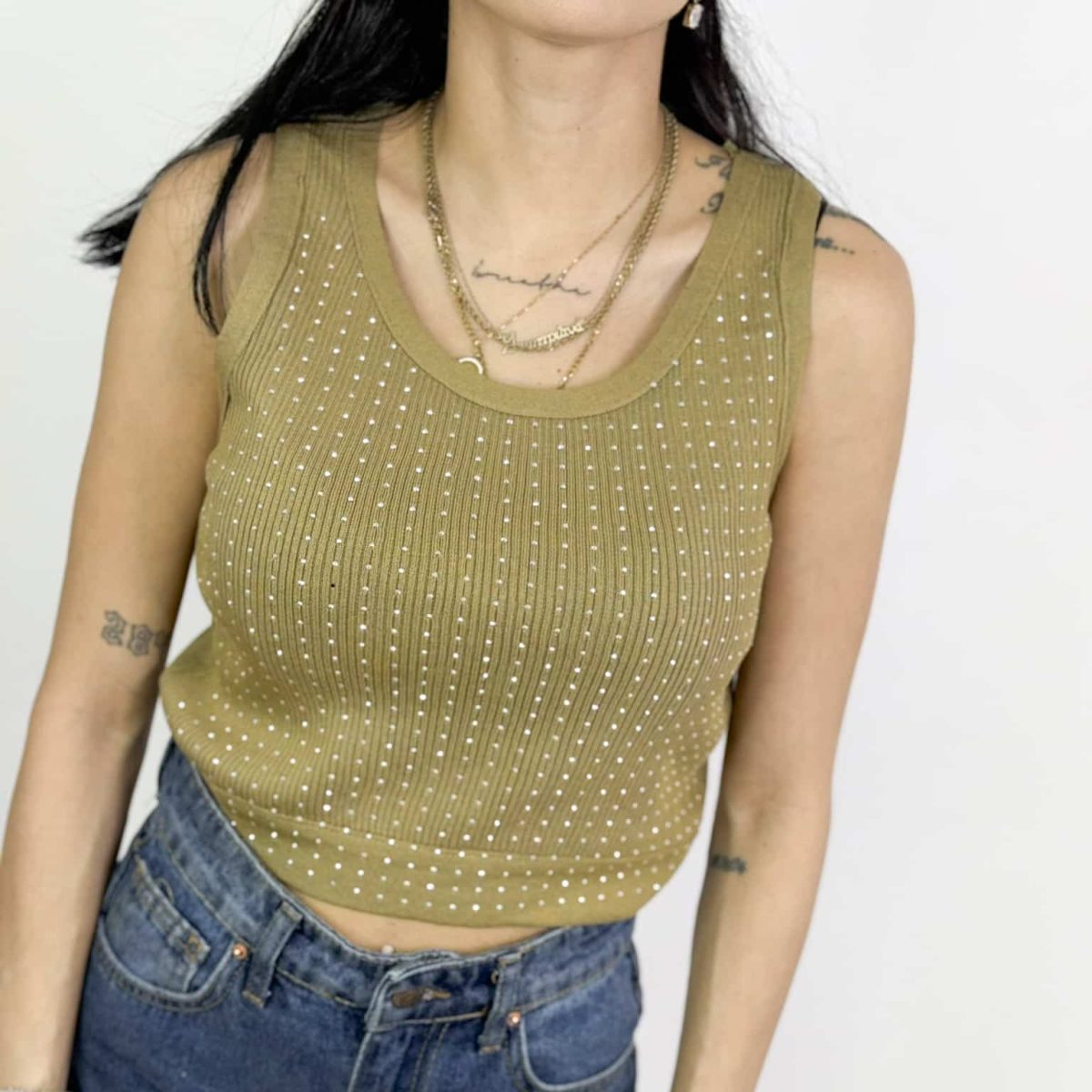 This chic ribbed knit crop tank top features a flattering scoop neckline and shimmering embellishments for a touch of glamour. Designed with a snug yet comfortable fit, it’s perfect for layering or wearing solo for a trendy, effortless look. Available in multiple versatile colors, this top is a must-have for any fashion-forward wardrobe.