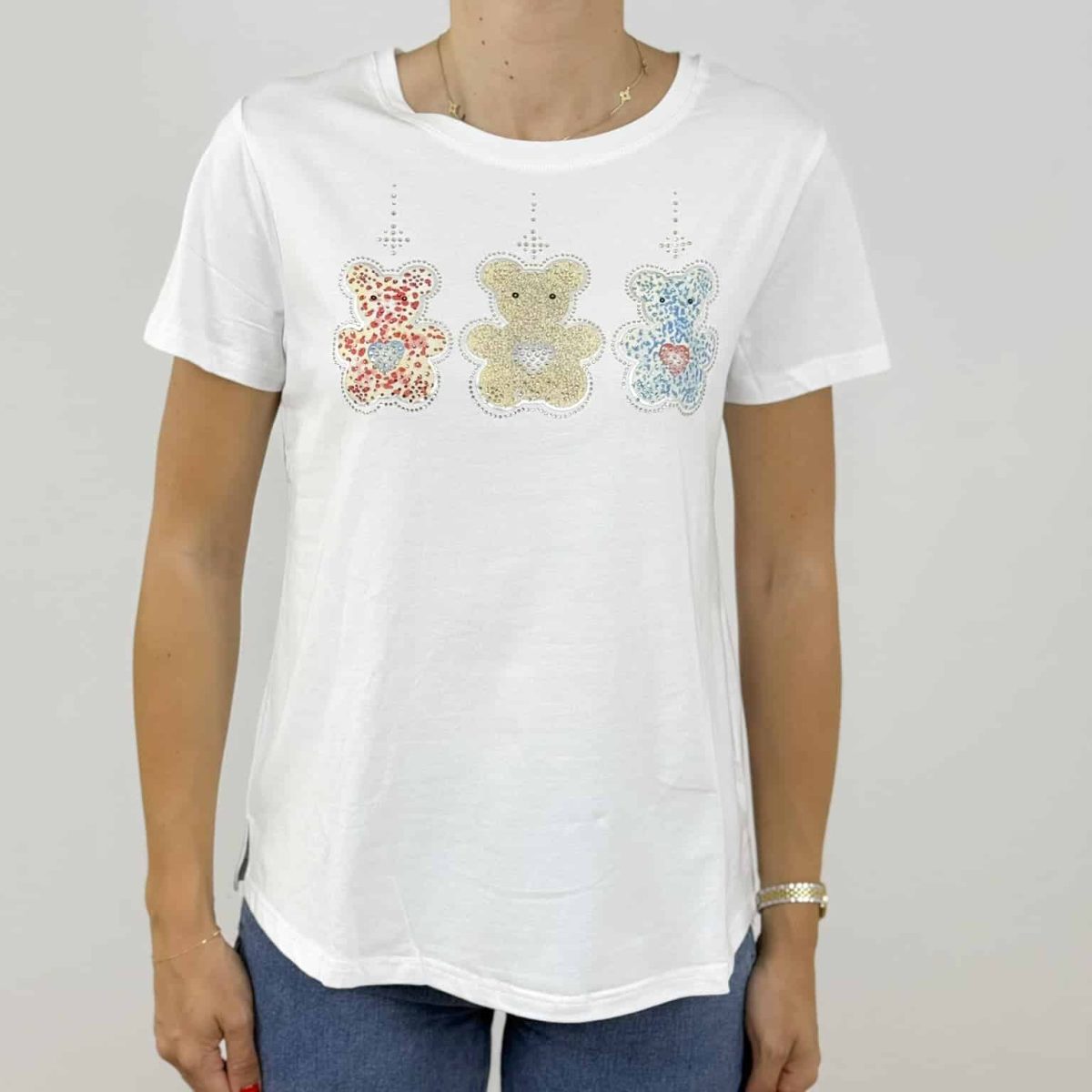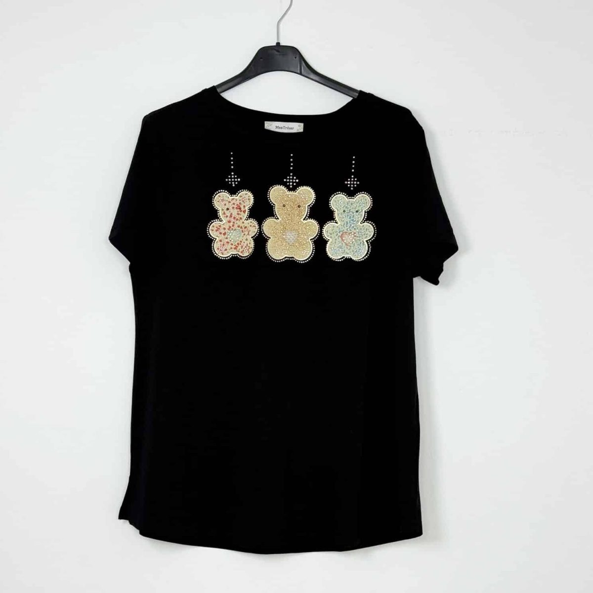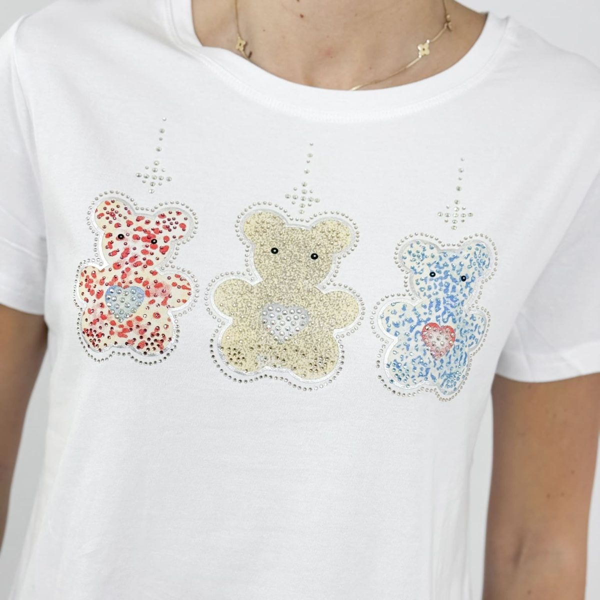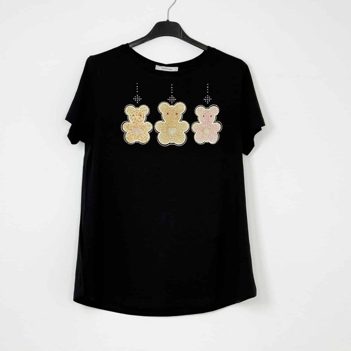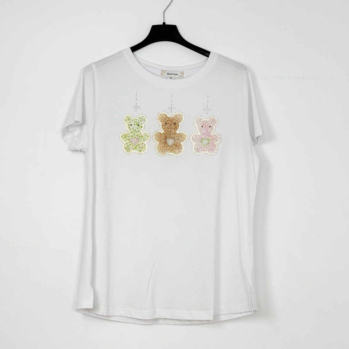 Add a playful twist to your summer outfits with the Sparkle Teddy Crystal Tee. This comfy cotton t-shirt features three sparkling teddy bear designs embellished with rhinestones and glitter detailing that bring youthful charm and modern shine. Available in white and black for versatile styling, it’s a fun yet stylish piece that suits all ages. Whether you’re dressing it up or down, this tee is a sweet addition to your summer wardrobe.