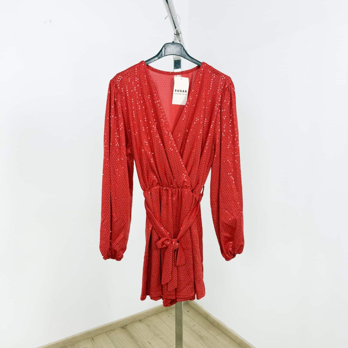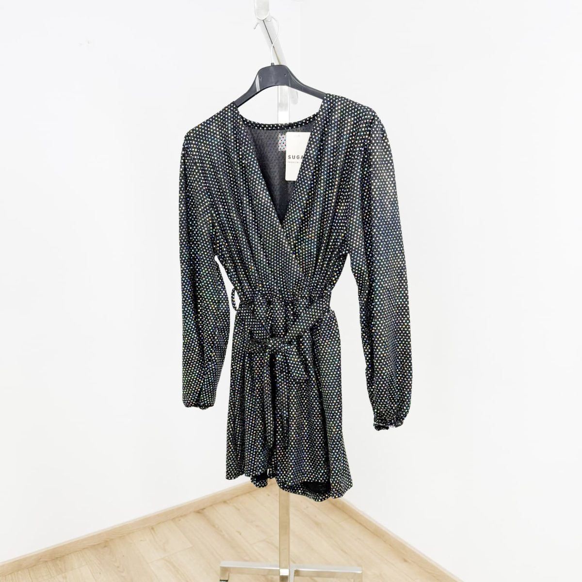 Turn heads and shine effortlessly in our Sparkle Wrap Playsuit, a glamorous piece designed for modern women who love to stand out. Featuring a chic wrap-front design with long sleeves and a flattering belted waist, this playsuit combines comfort with an elegant silhouette. The shimmering fabric catches the light beautifully, making it the perfect choice for evenings, parties, and special occasions.