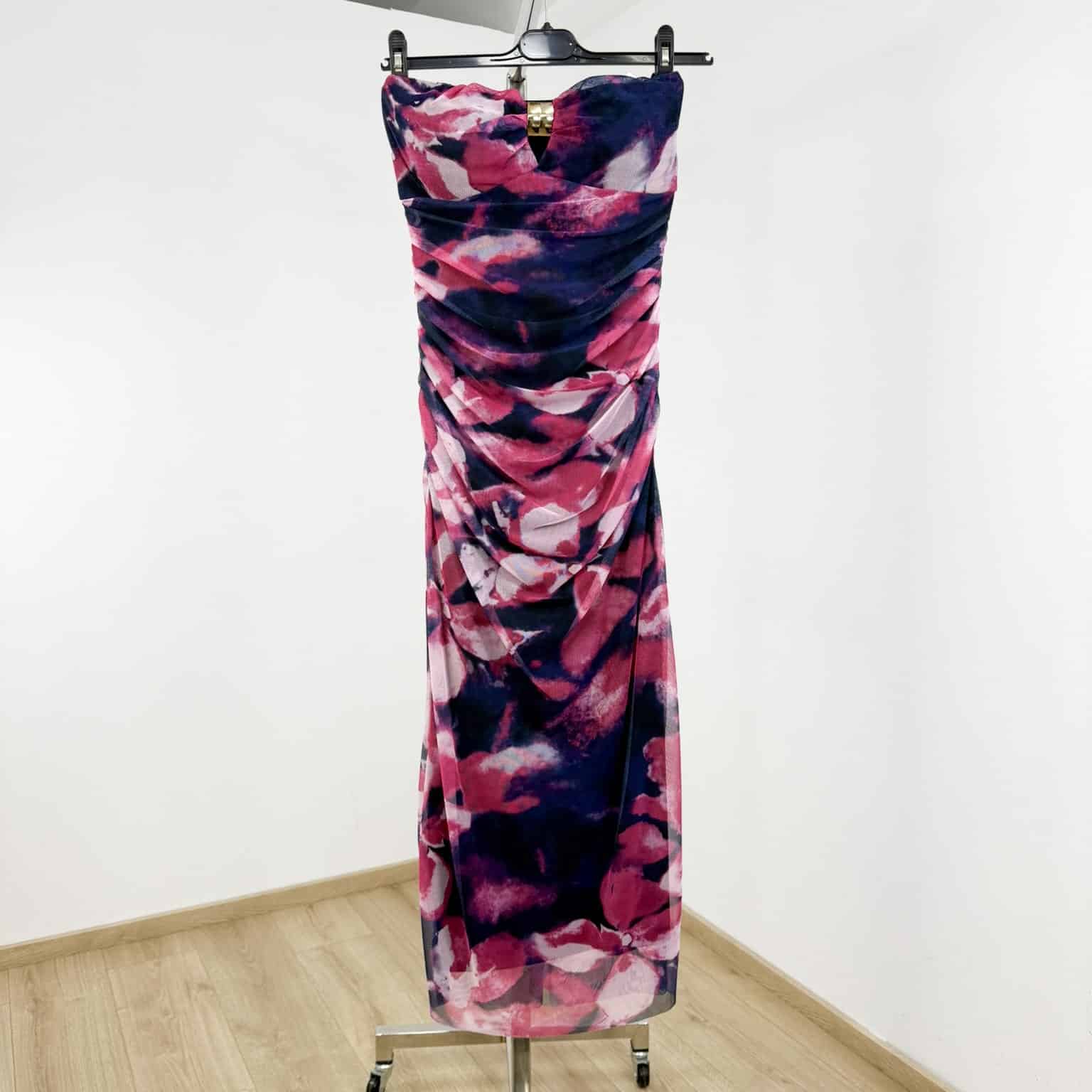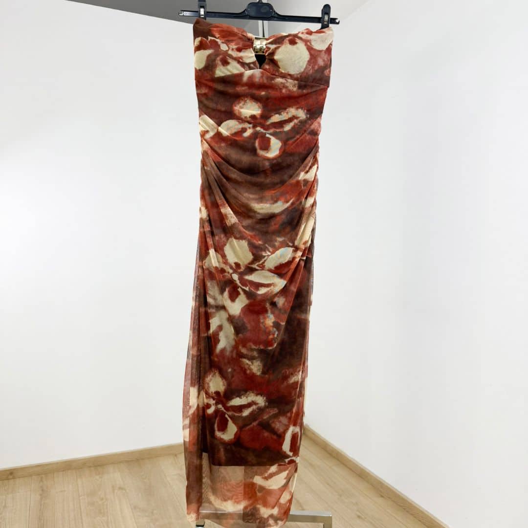 Strapless Print Ruched Midi Dress with Ring Detail