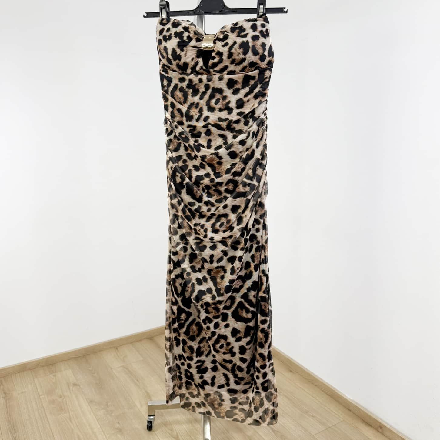 Unleash your wild side with this striking strapless midi dress featuring an all-over abstract print and body-hugging ruched design. The gathered bust is accented with a stylish central ring detail, while the soft, stretch fabric flatters your figure from every angle. Perfect for a night out, summer parties, or a bold daytime look that turns heads.