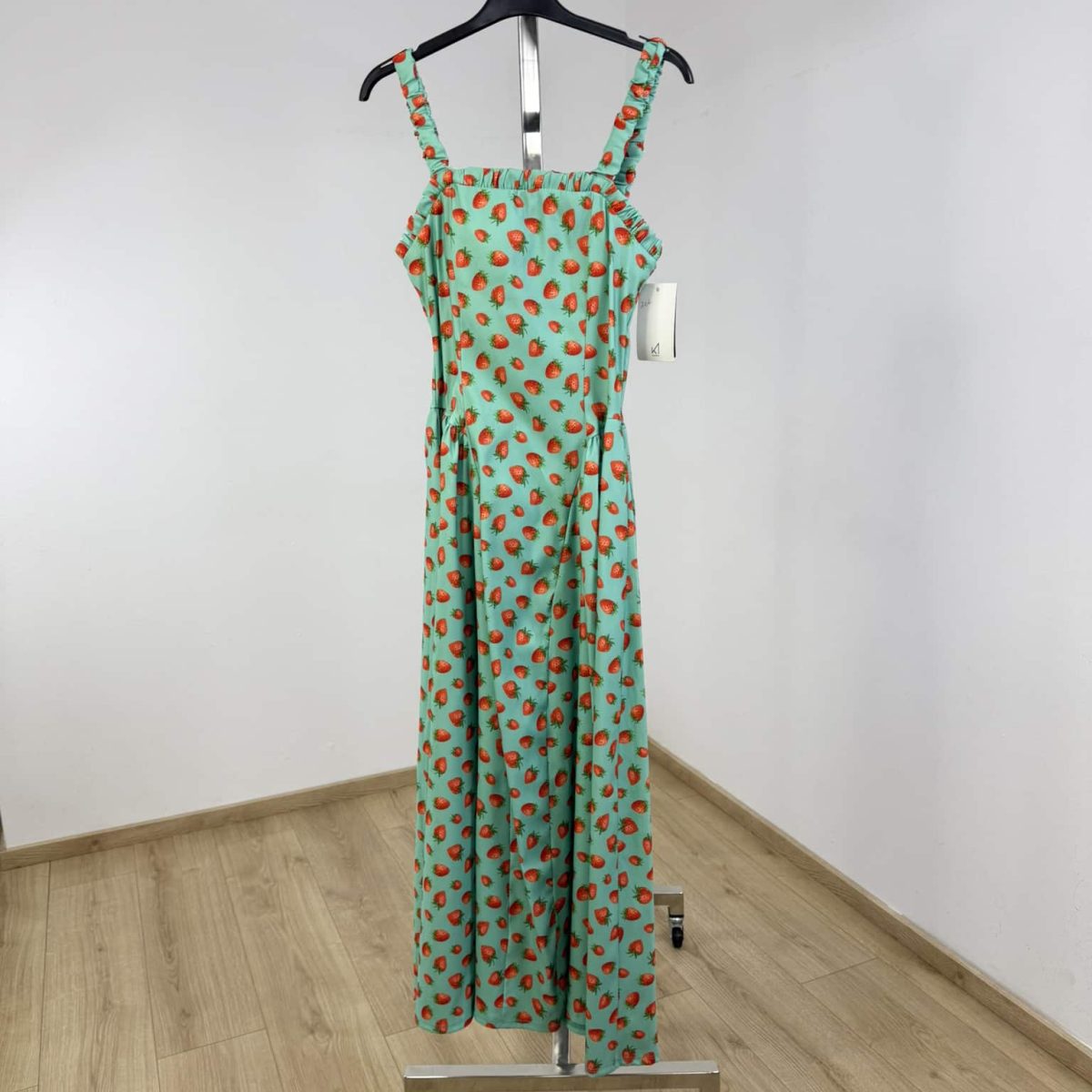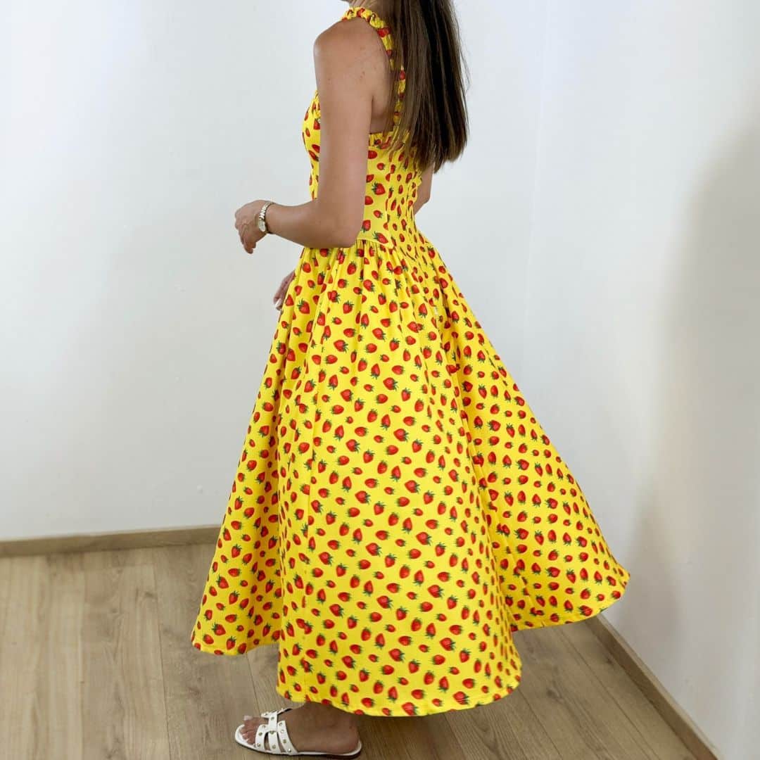 Step into summer sweetness with our Strawberry Breeze Cotton Midi Dress, the perfect blend of playful charm and feminine elegance. This sleeveless dress features a flattering square neckline, wide ruffled straps, and a fitted bodice that flows effortlessly into a flared midi skirt — all adorned with a cheerful strawberry print that radiates sunny-day vibes.
