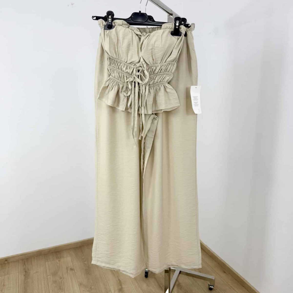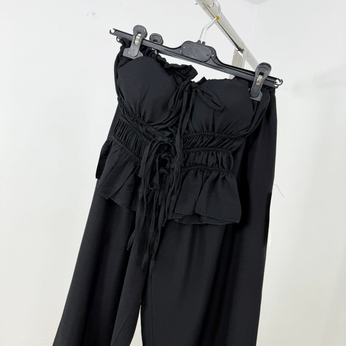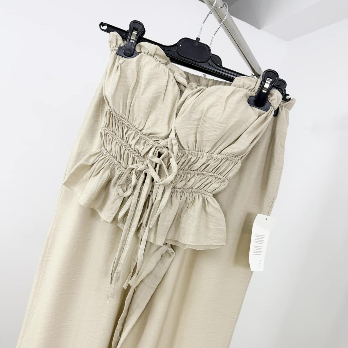 Step into effortless elegance with this chic strapless 2-piece set, designed for summer days and nights. Featuring a smocked bustier-style top with front tie details and wide-leg high-waist pants, it combines comfort with modern femininity. Perfect for vacations, evening strolls, or stylish casual outings.