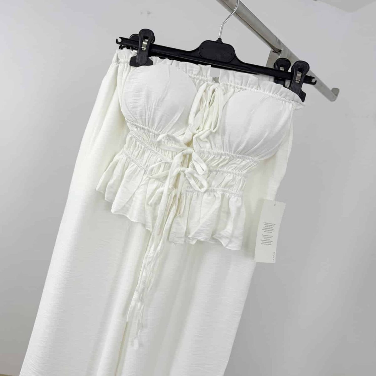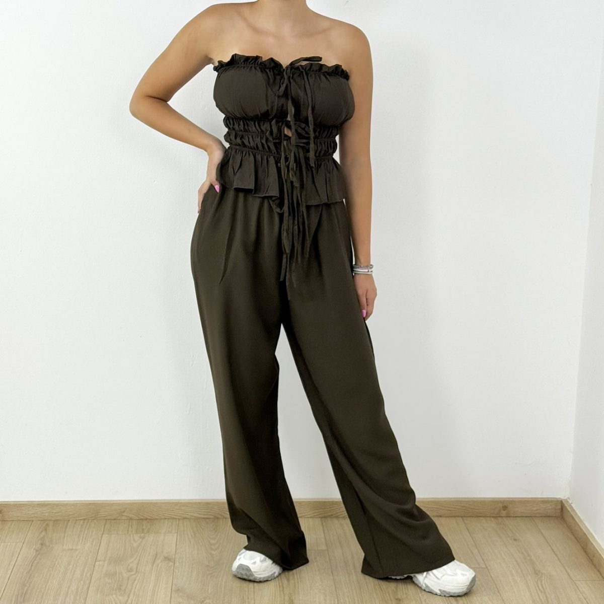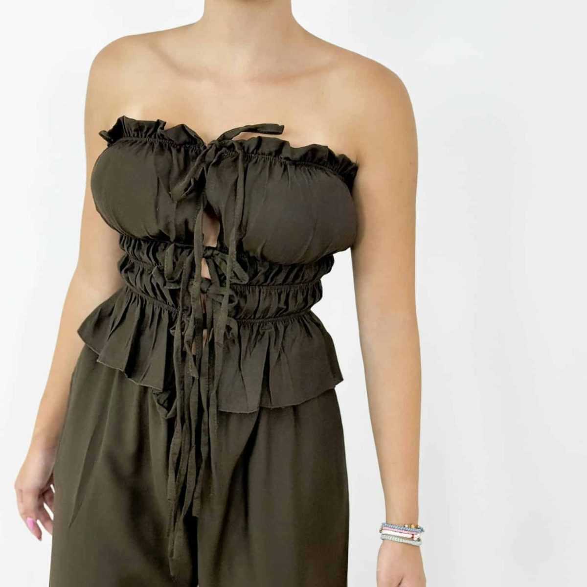 Step into effortless elegance with this chic strapless 2-piece set, designed for summer days and nights. Featuring a smocked bustier-style top with front tie details and wide-leg high-waist pants, it combines comfort with modern femininity. Perfect for vacations, evening strolls, or stylish casual outings.
