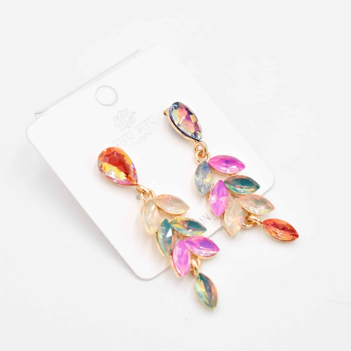 Make every look unforgettable with the Sunset Prism Drop Earrings. These cascading crystal drops feature a radiant mix of vivid hues—pink, orange, teal, and iridescent tones—resembling the magic of a summer sunset. With a sleek gold setting and a flattering elongated shape, they add instant drama and luminosity to both casual and formal outfits. Bold, bright, and irresistibly chic.