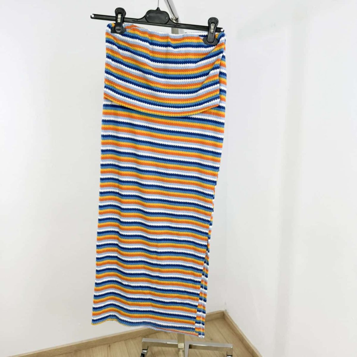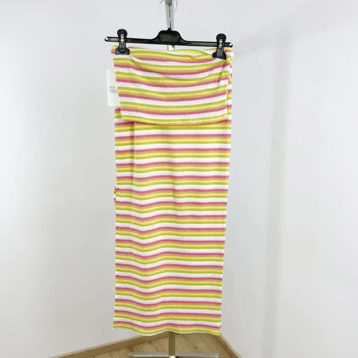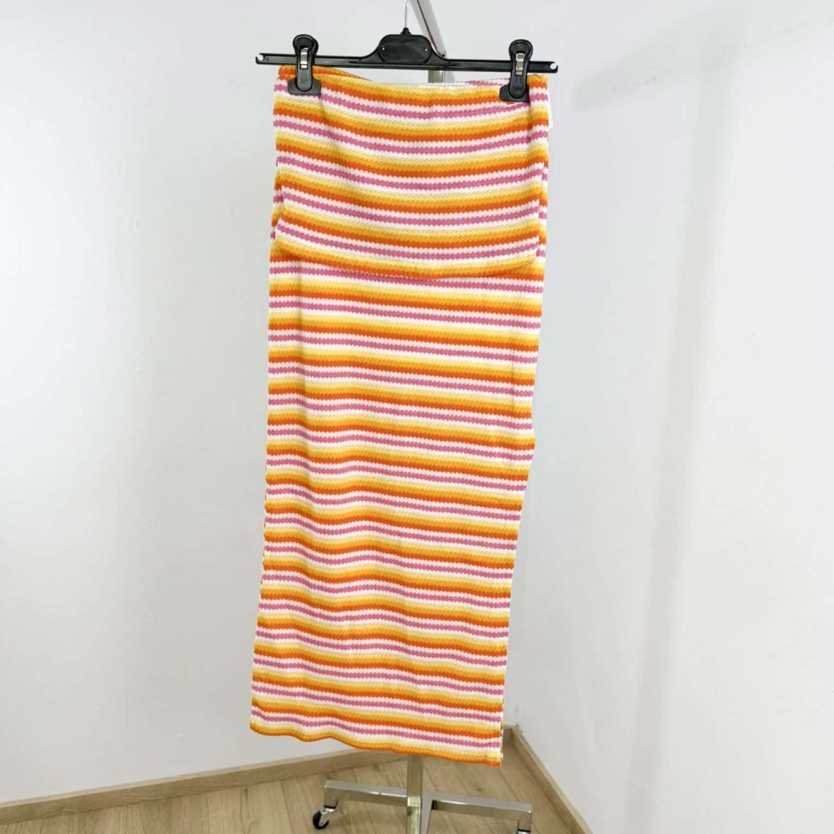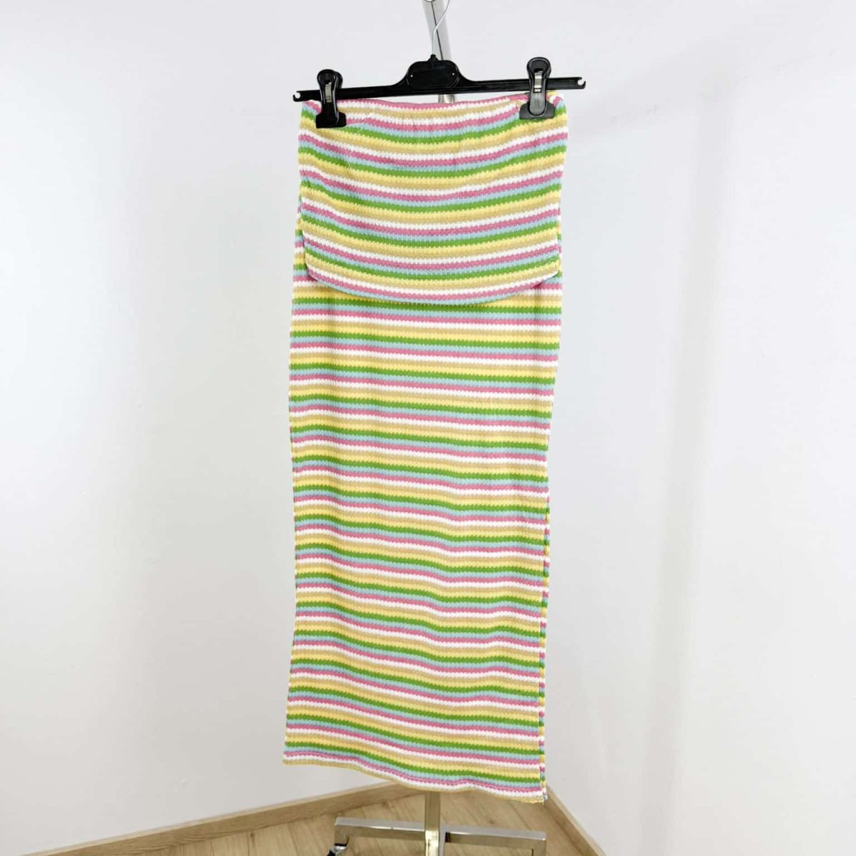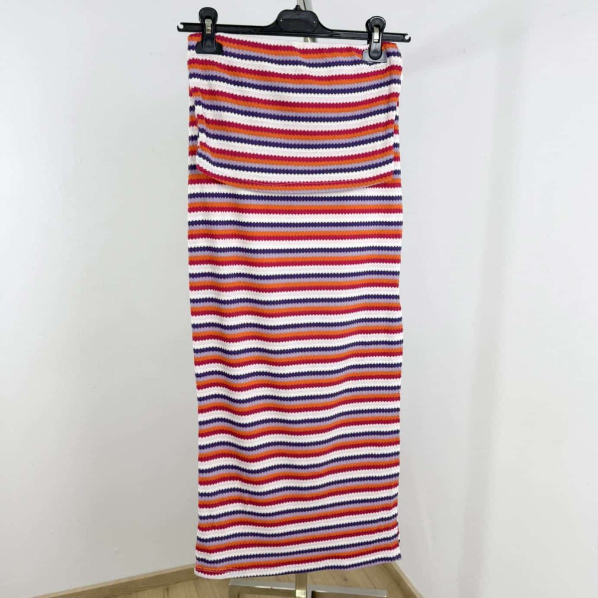 Turn heads this summer with our Sunset Stripes Bandeau Set – a chic and vibrant two-piece outfit that combines playful color with effortless elegance. Featuring a strapless bandeau top and a body-hugging midi skirt, this set is crafted from soft stretch knit fabric with multicolored horizontal stripes for a flattering silhouette. Perfect for beach days, casual outings, or summer getaways, this lightweight ensemble will keep you cool and stylish all day long. Available in multiple fun color combinations.