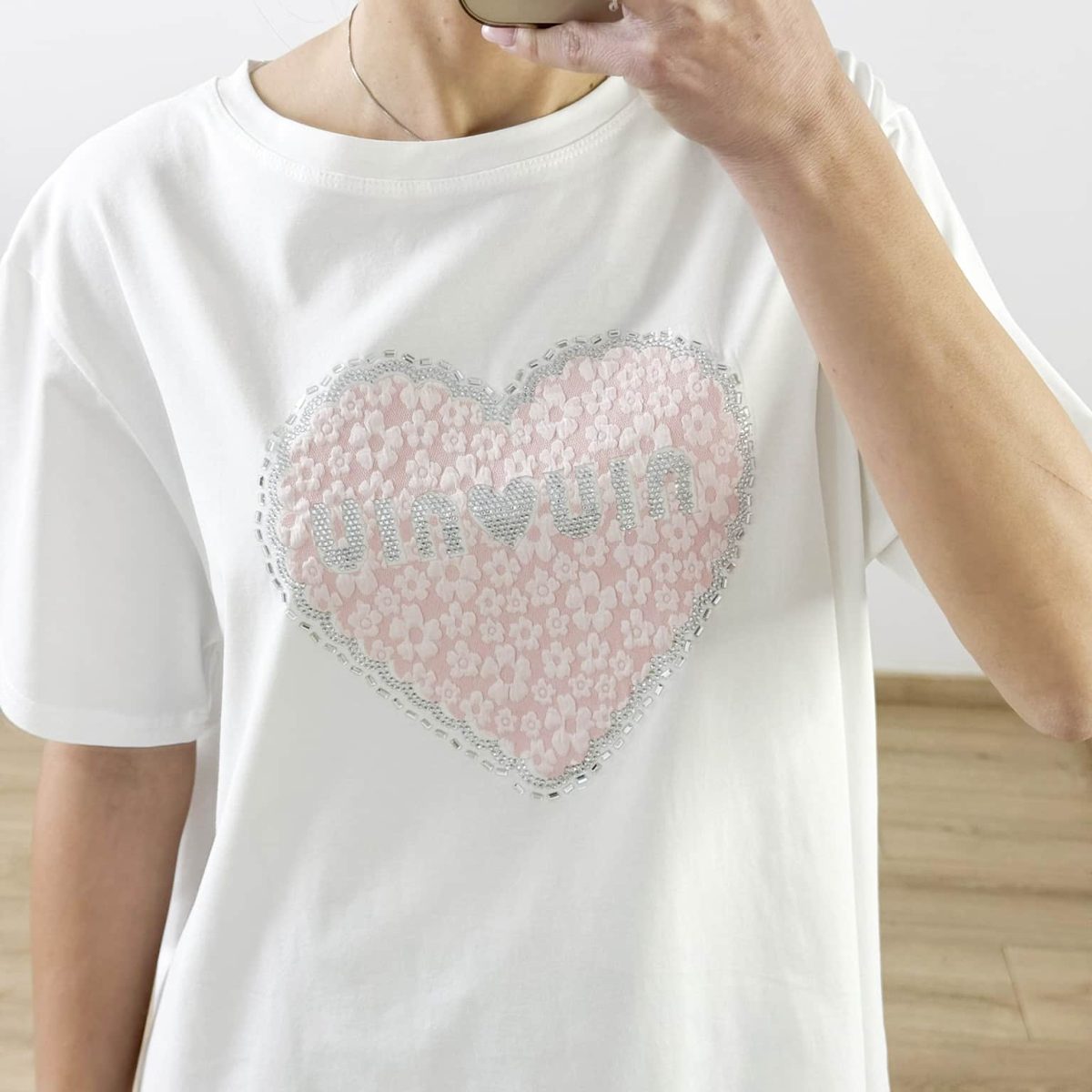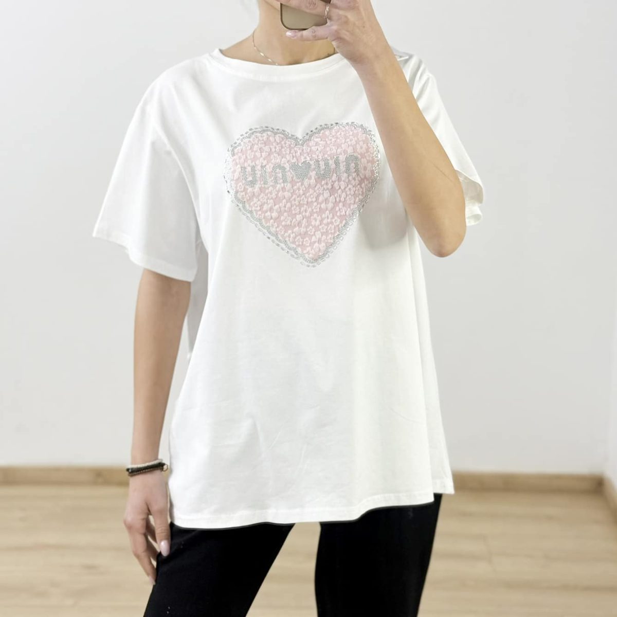 Bring playful romance to your look with the Sweetheart Sparkle Tee — a cotton t-shirt featuring a sequin-embellished pink heart with a shimmering silver border and decorative lettering. Available in black and white, it’s perfect for adding charm and a hint of glam to your everyday outfit.