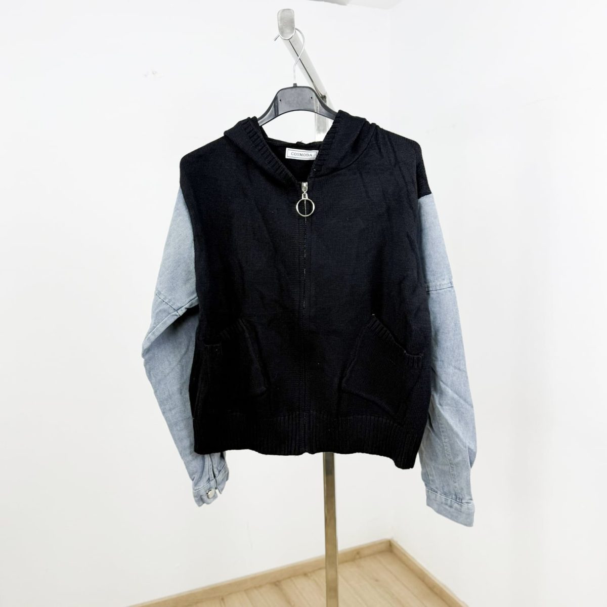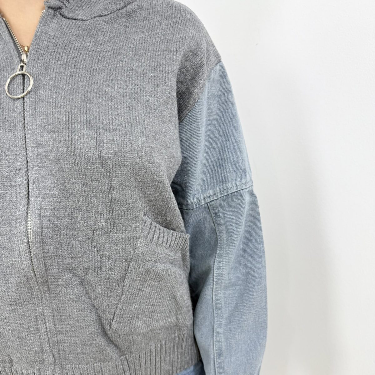 The Trendy Knit Denim Sleeve Hoodie features a full zip front with a statement ring pull, a cozy hood for added warmth, and front pockets for everyday practicality. Its relaxed yet flattering fit makes it ideal for layering over tees, tops, or even dresses — perfect for transitioning between seasons while maintaining an effortlessly cool vibe.