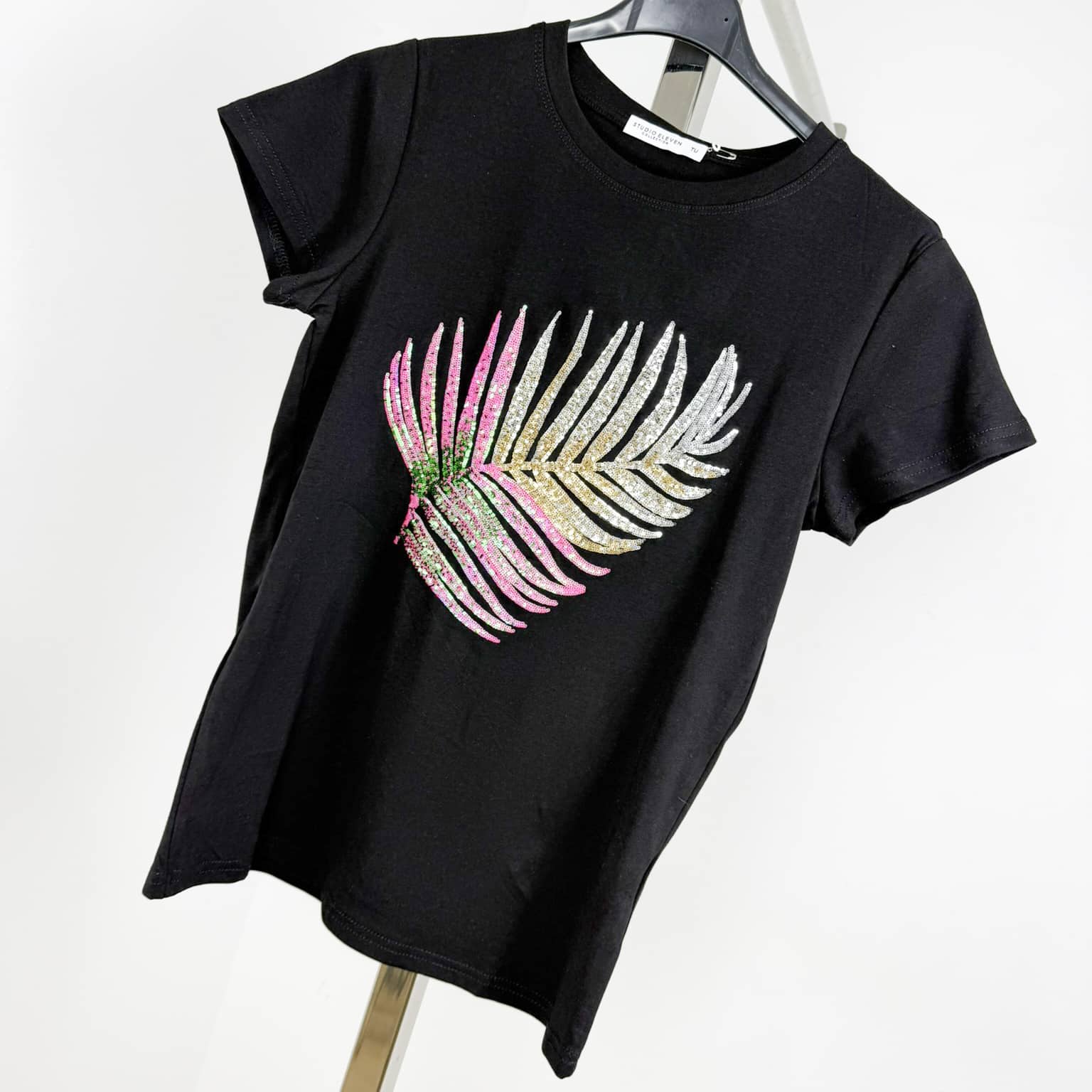 Add a touch of tropical elegance to your wardrobe with the Tropical Glam Sequin Palm T-Shirt. Featuring a stunning palm leaf design adorned with shimmering sequins in vibrant gradient colors, this t-shirt offers a chic and sophisticated look. Made from soft, breathable fabric, it ensures comfort while keeping you stylish. Available in classic black and white, with options in blue-green and pink-gold variations, this versatile tee pairs effortlessly with jeans, skirts, or shorts for a fresh and fashionable outfit. Perfect for adding a tropical vibe to your everyday style!