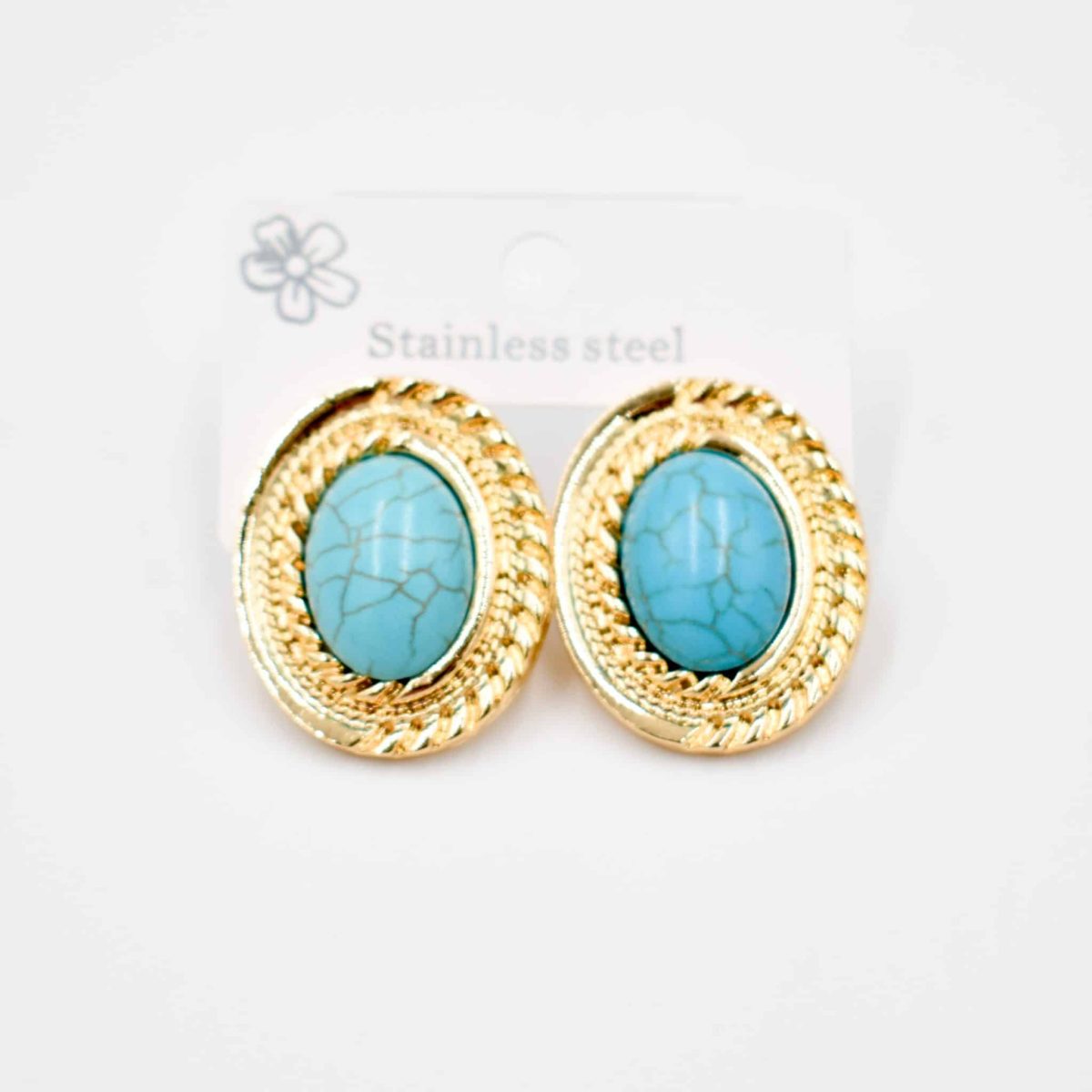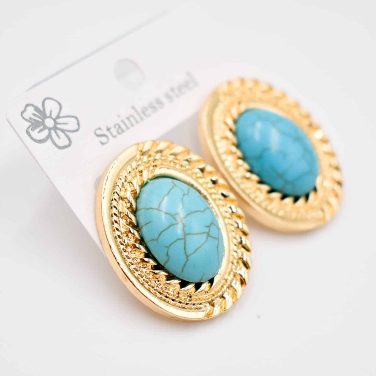 Add a touch of vintage elegance to your summer look with these stunning oval stud earrings featuring a bright turquoise center stone. Set in a bold textured gold frame, these earrings channel timeless charm with a fresh, modern twist.