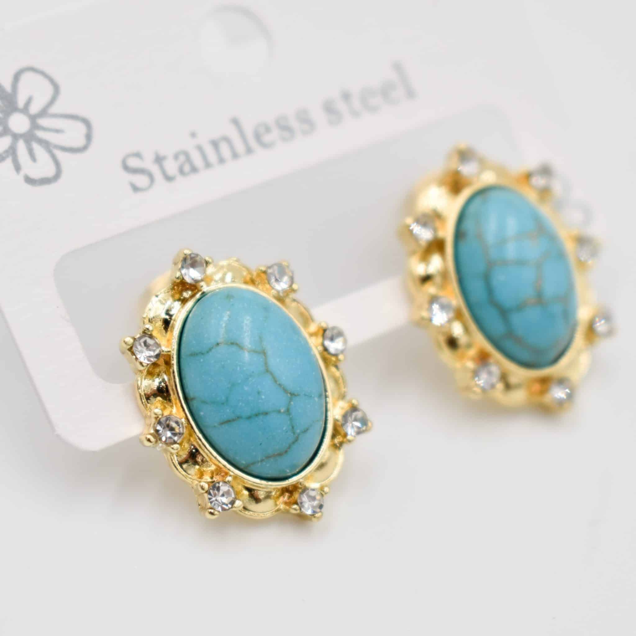 Add a touch of elegance and summer flair to your look with these vintage-inspired turquoise stud earrings. Featuring a vibrant oval turquoise stone framed in a gold-tone setting with sparkling crystal accents, they strike the perfect balance between classic and bold.