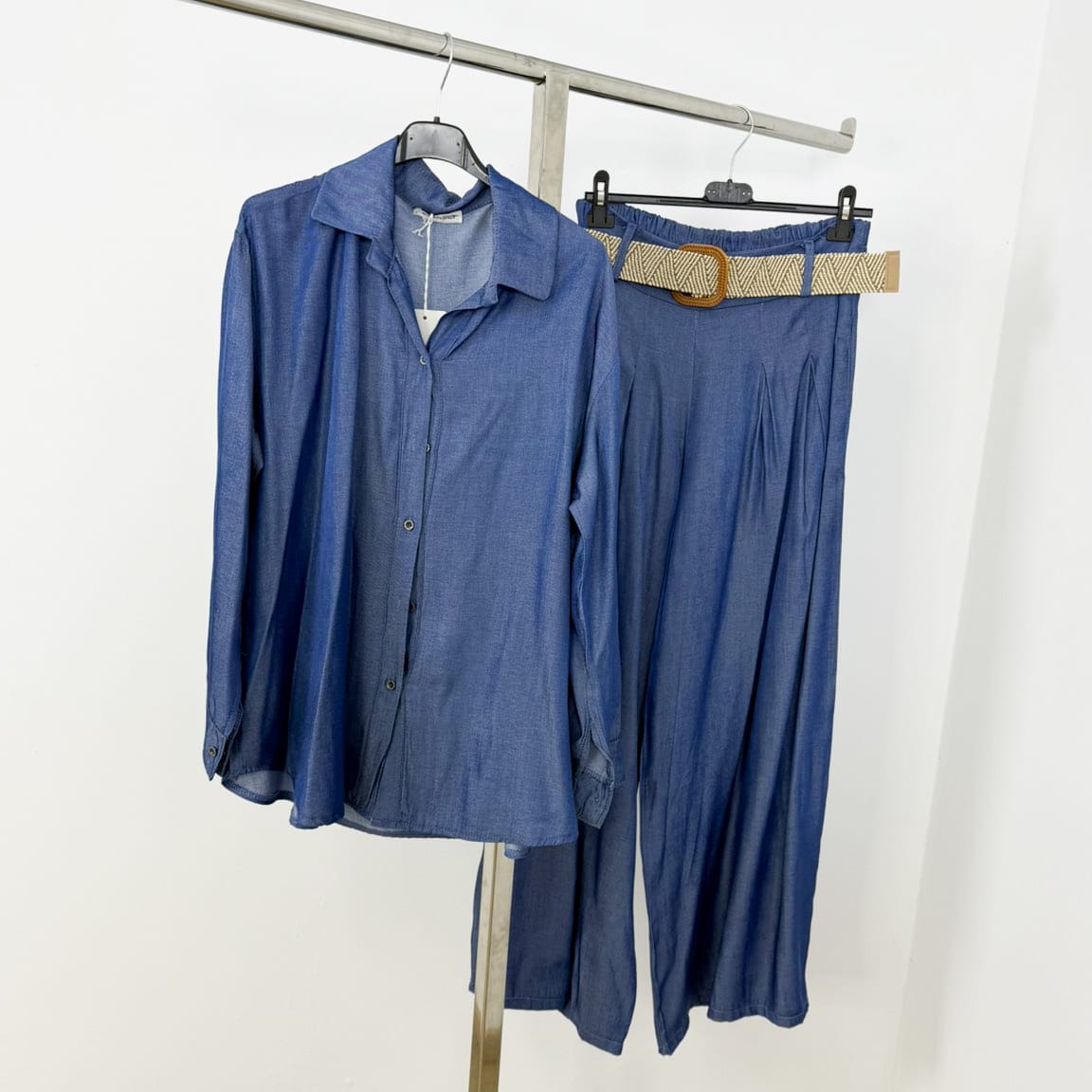Effortlessly stylish and endlessly versatile, the Urban Denim Breeze Two-Piece Set is your go-to outfit for modern everyday elegance. Featuring a lightweight denim-look shirt with a relaxed fit and matching high-waisted wide-leg pants, this set creates a chic and coordinated silhouette.