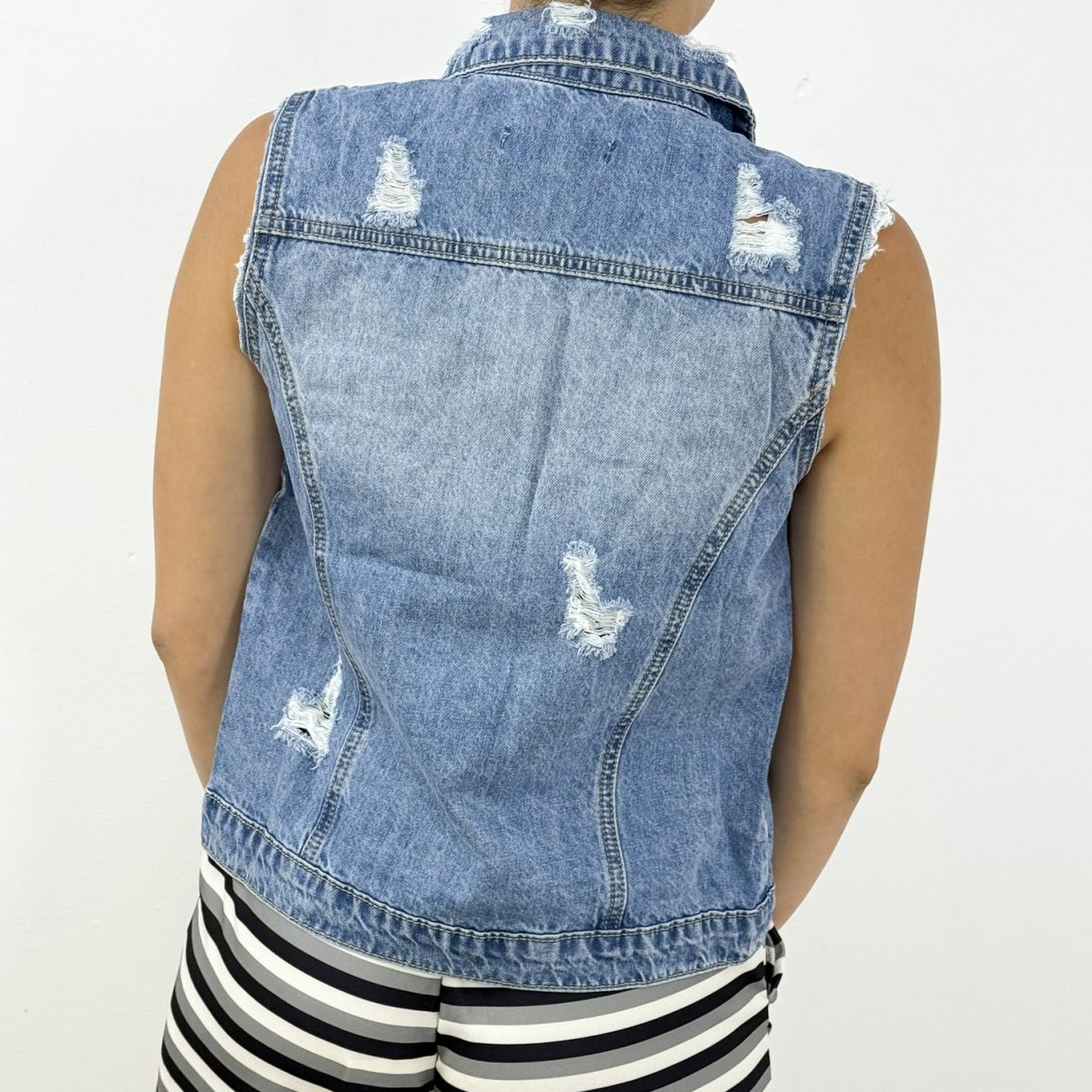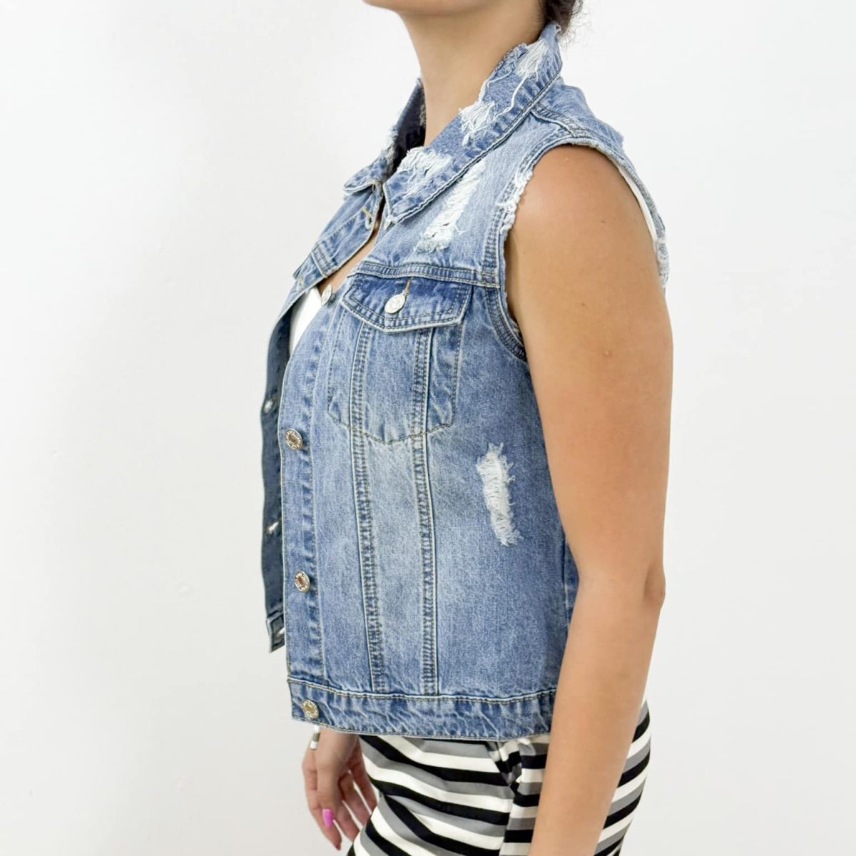 Effortlessly cool and edgy, this sleeveless distressed denim vest is your must-have summer layer. Perfect for adding attitude to any outfit, it’s designed for modern women who love a casual yet confident look.