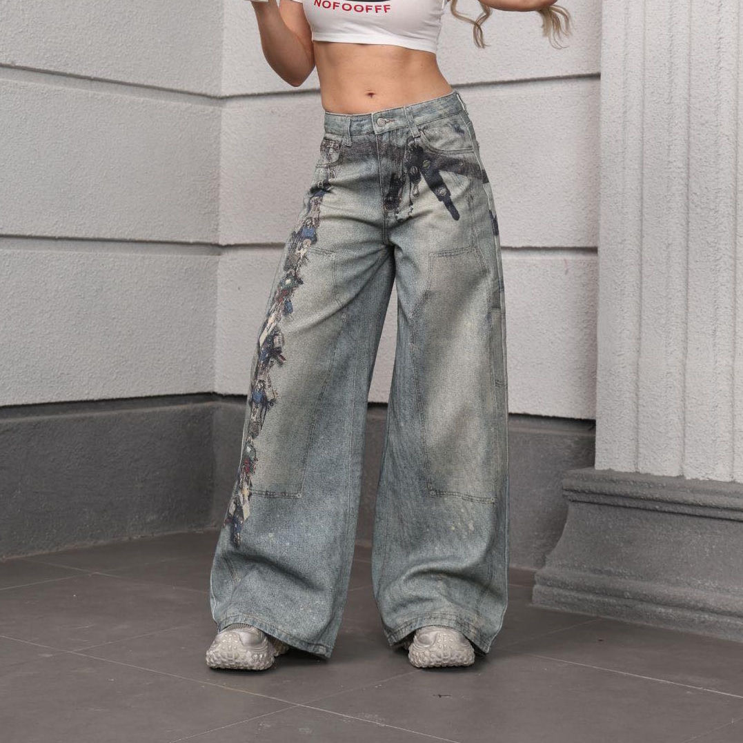 Make a bold street-style statement with these eye-catching Urban Graffiti Wide-Leg Denim Jeans. Designed with a trendy oversized silhouette, these jeans feature a relaxed wide-leg fit that delivers both comfort and modern fashion appeal. The washed vintage denim base is elevated with artistic graffiti-style prints and edgy distressed accents, creating a unique urban aesthetic that stands out effortlessly. Perfect for casual streetwear looks, these jeans pair beautifully with crop tops, oversized tees, or sporty sneakers for an effortlessly cool outfit. Ideal for everyday wear, city outings, and fashion-forward styling.